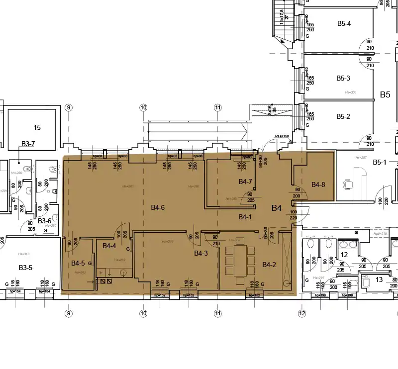 Sekretariat, open space, gabinet, salka konferencyjna, pokój zamknięty, archiwum, serwerownia, kuchnia.
