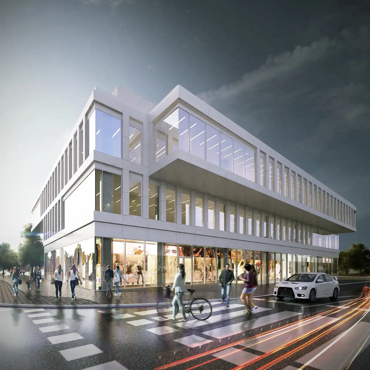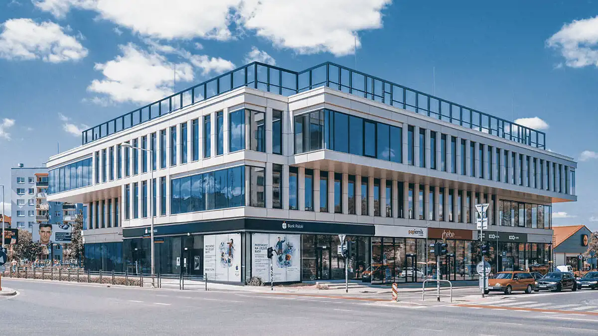 nowy, trzykondygnacyjny obiekt, w którym na parterze znajdują się lokale usługowe i handlowe, a na piętrach powyżej powierzchnie biurowe.