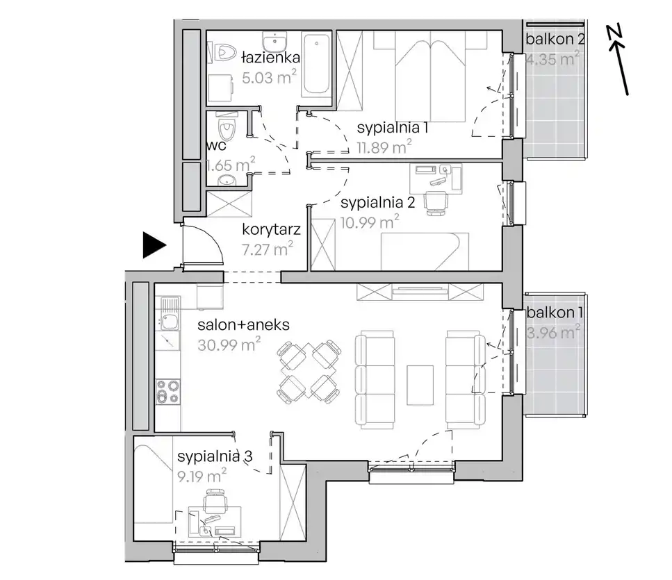 Centralną część tworzy przestronny salon z aneksem kuchennym (30,99 m²) — jasny, wygodny i ustawny. Z salonu można wyjść na balkon 1 (3,96 m²), idealny na poranną kawę.
