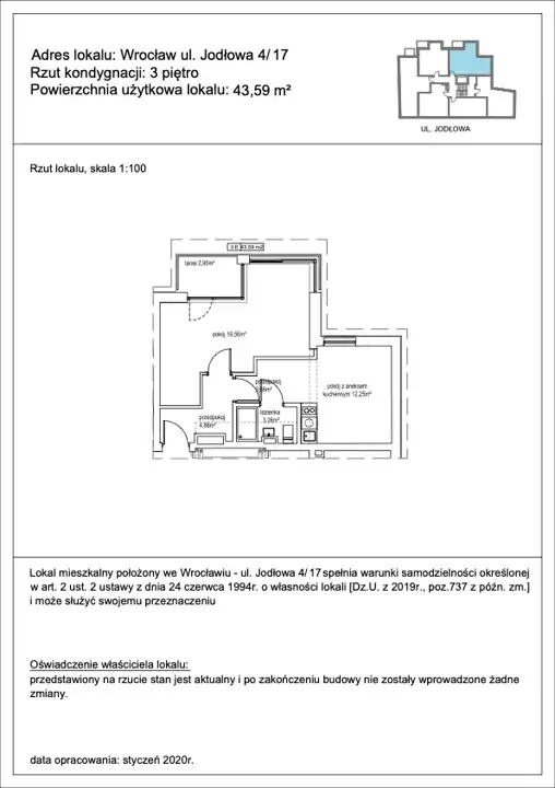 - Charakterystyka mieszkania 43.59 m2, 2 pokoje