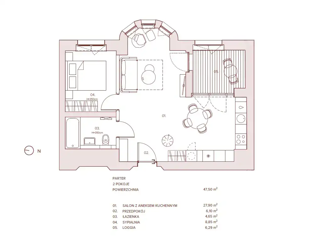- Charakterystyka mieszkania 47.5 m2, 2 pokoje