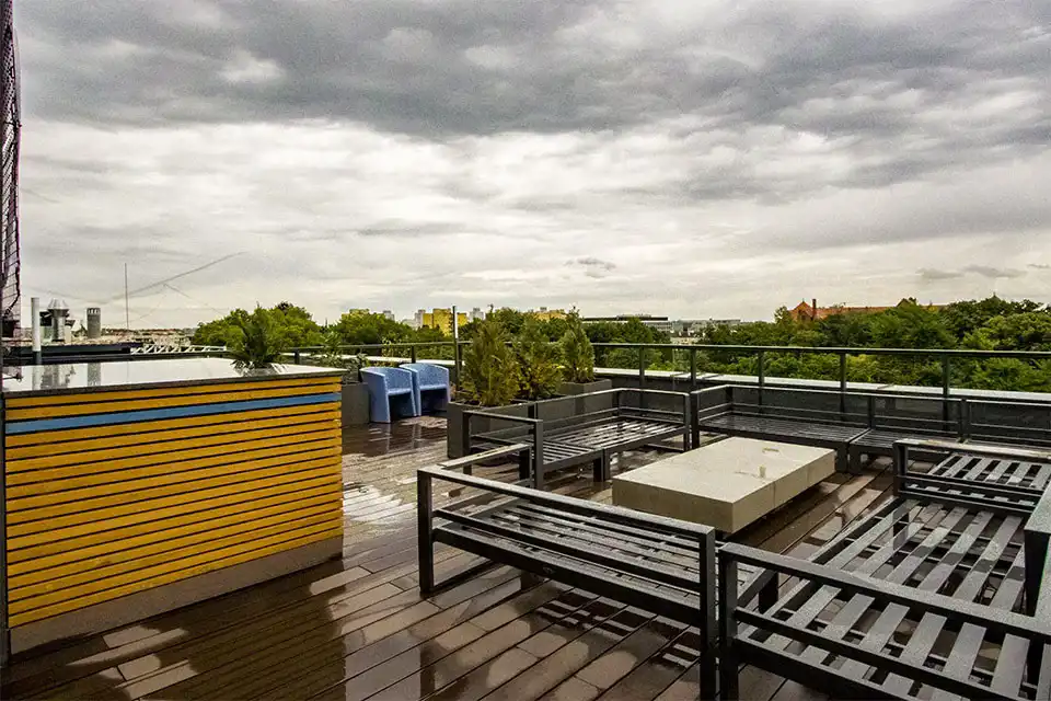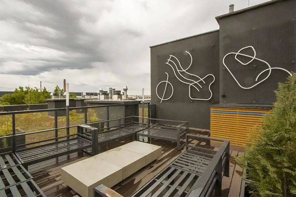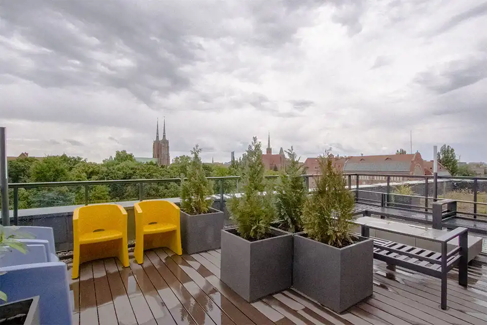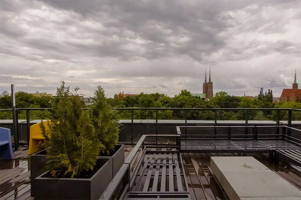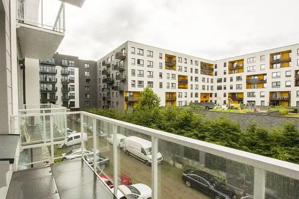 Na terenie osiedla zadbano także o system umożliwiający mobilne otwieranie drzwi, wind i bramy wjazdowej do garażu oraz ekologiczne rozwiązania: zbiornik retencyjny wody opadowej, nawiewniki antysmogowe, zielony dach i oświetlenie LED.