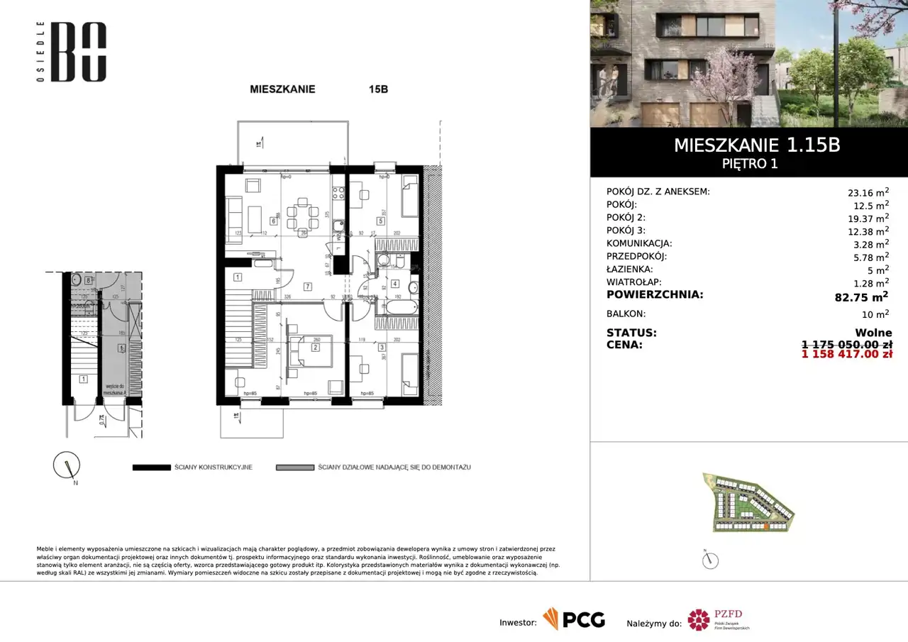 Apartament 4-pokojowy o powierzchni 82,63 m2 z balkonem, 4 pokoje, numer 1.15B na 1 pietrze w nowoczesnym kompleksie mieszkaniowym położonym na wrocławskich Kowalach.