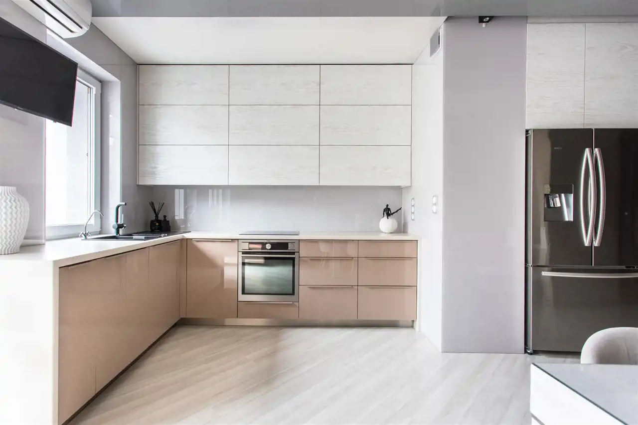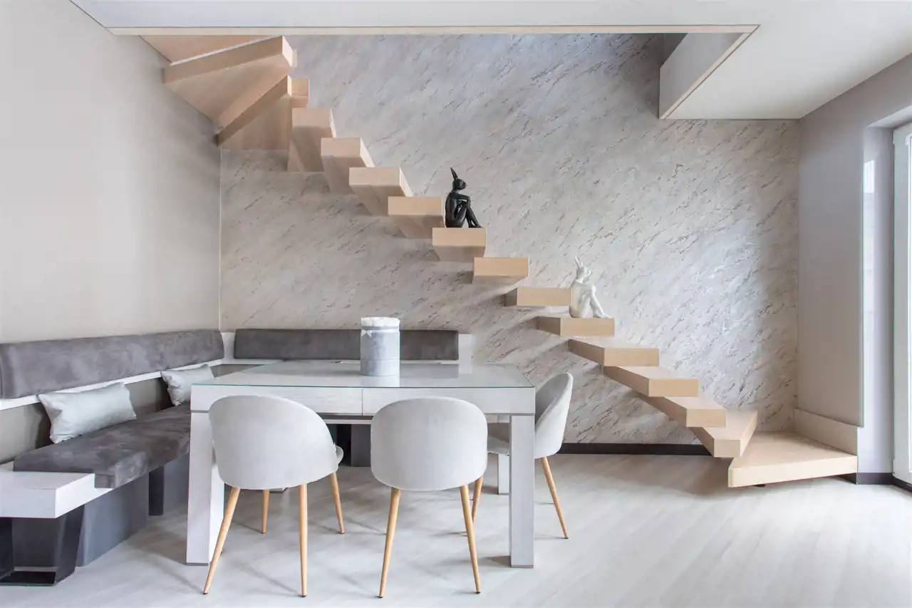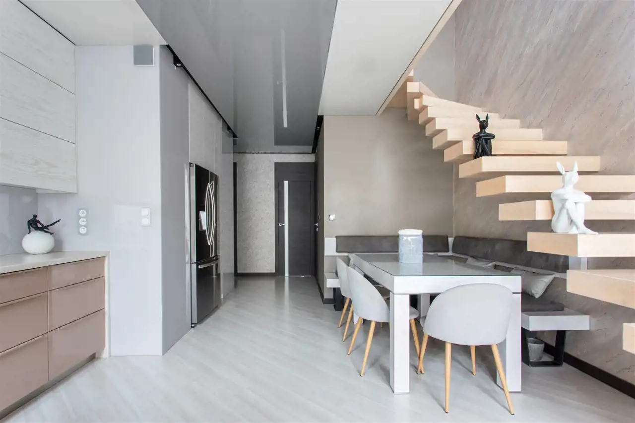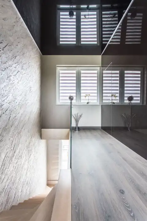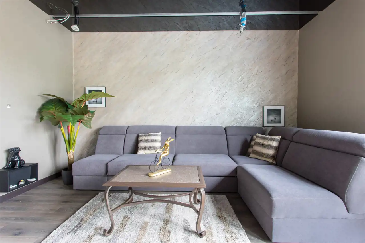 Na ścianach tynki strukturalne, w kuchni Lakobel, na sufitach Barrisol.