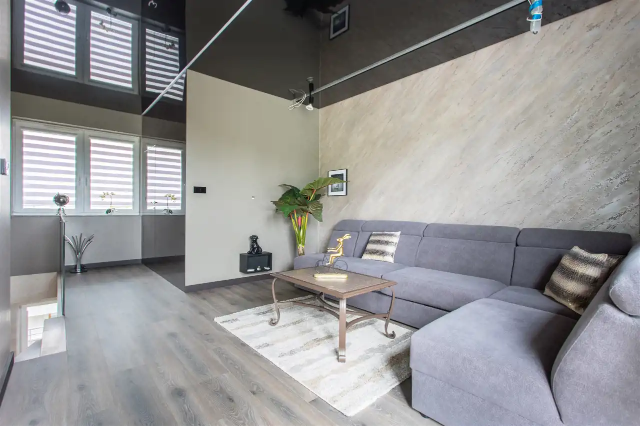 Apartament na obu poziomach wyposażony jest w niezależne klimatyzacje, w system regulacji oświetlenia oraz ogrzewanie podłogowe. Do wykończenia użyto materiałów bardzo wysokiej jakości.