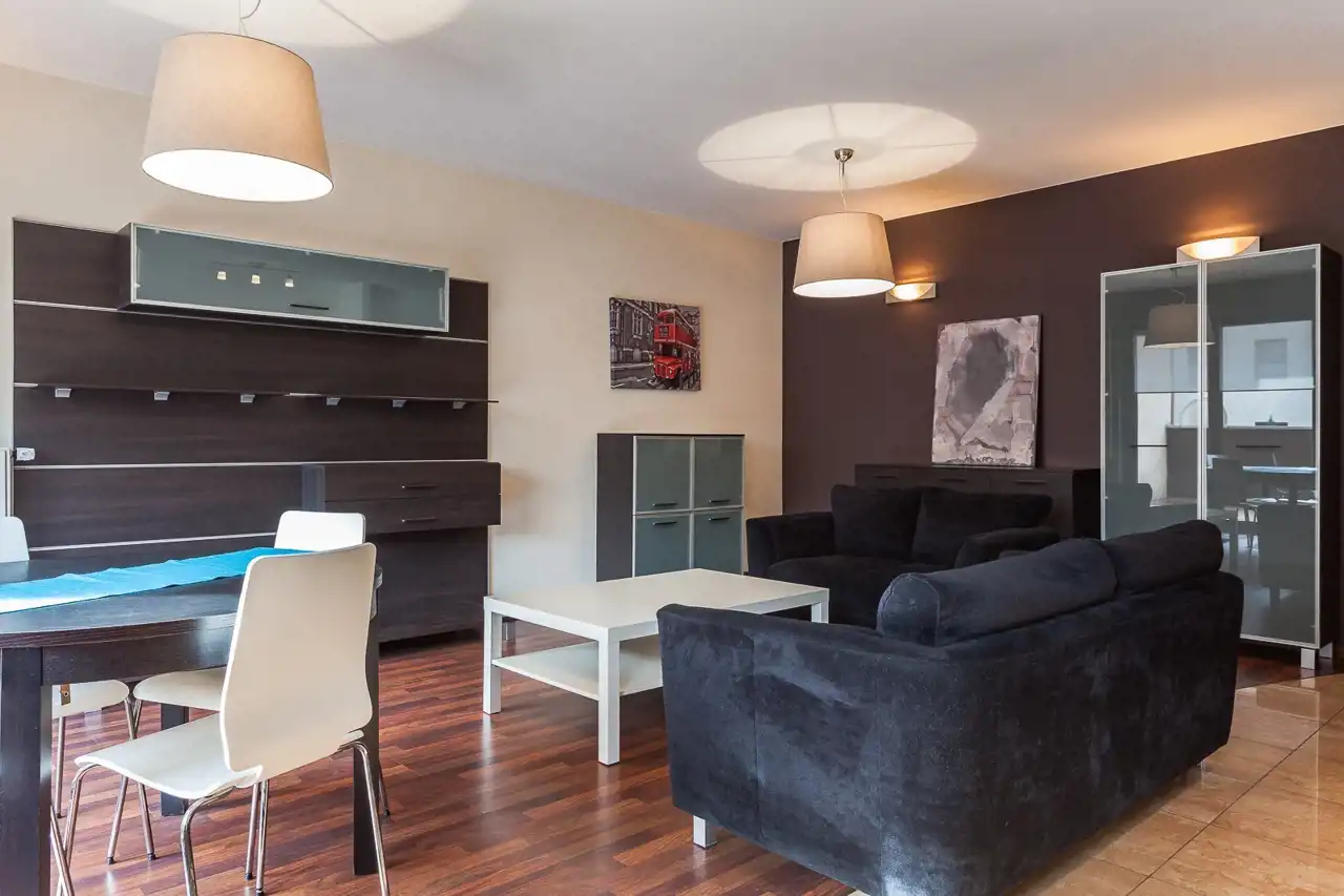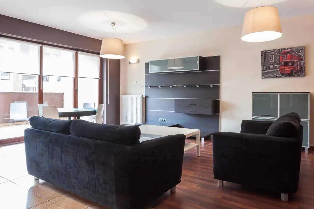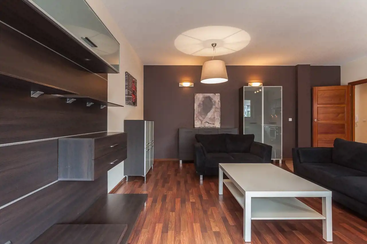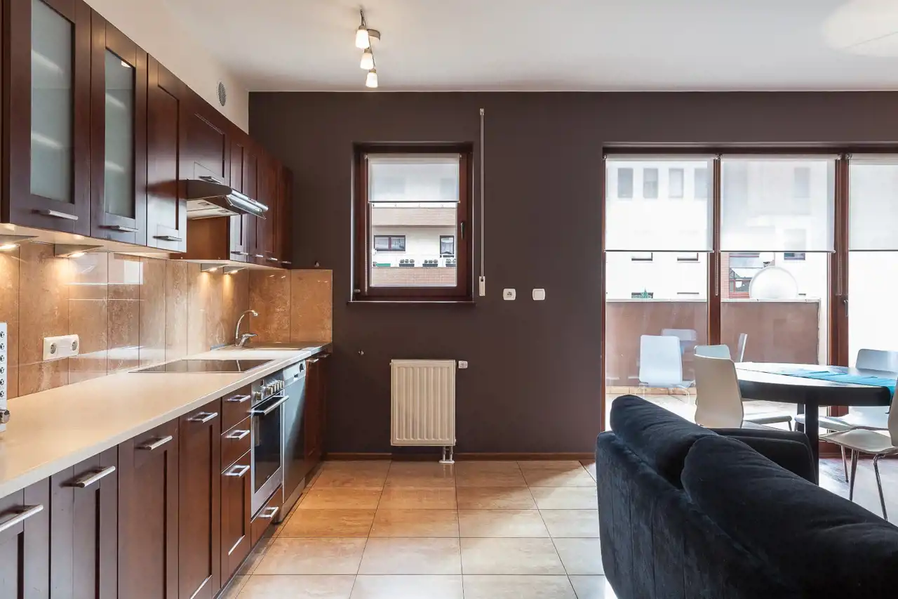 Mieszkanie ma powierzchnię 73,60 m² i składa się z przestronnego, jasnego salonu połączonego z aneksem kuchennym, z którego prowadzi wyjście na imponujący, około 30-metrowy taras – idealne miejsce do wypoczynku i spotkań na świeżym powietrzu.