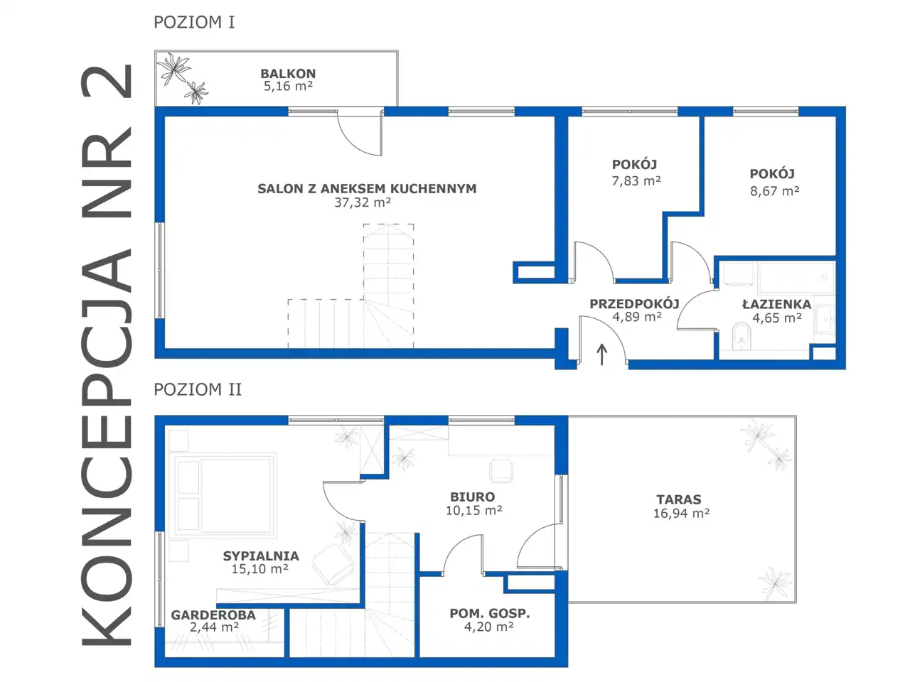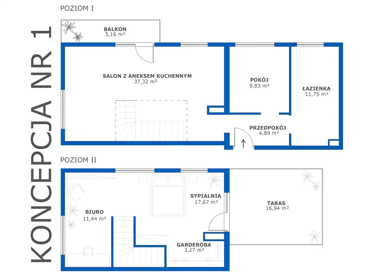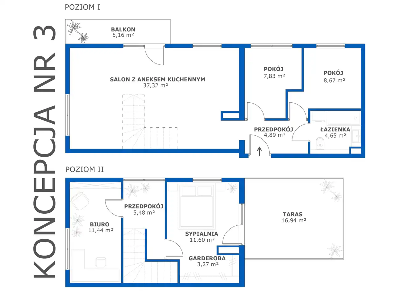 Mieszkanie o powierzchni 93,72 m2 położone jest na dwóch poziomach i składa się z następujących pomieszczeń: