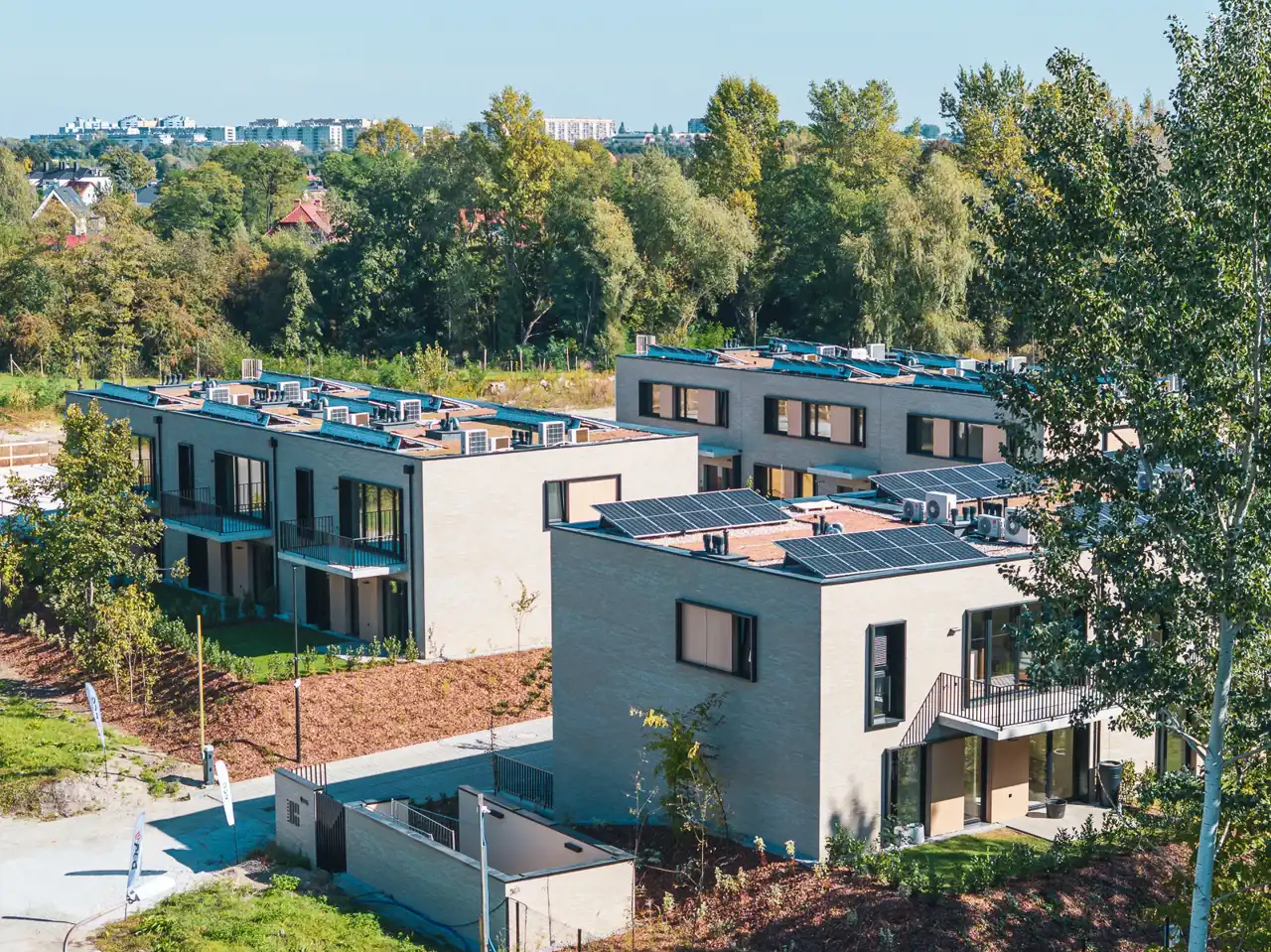 W standardzie znajduje się wszystko, czego dziś oczekuje świadomy nabywca: pompa ciepła, fotowoltaika, ogrzewanie podłogowe, system Smart Home. Do dyspozycji mieszkańców są dwustanowiskowe garaże o powierzchni 31,88 m2 z bezpośrednim wejściem do apartamentu oraz dodatkowe miejsca postojowe na podjeździe.