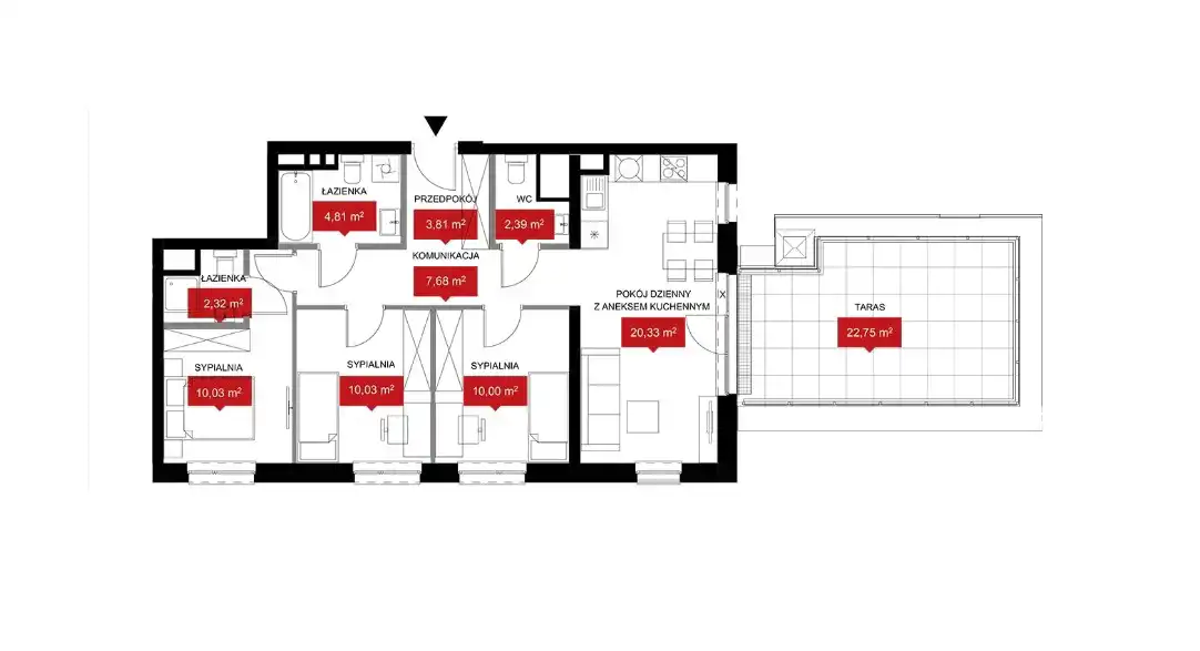Funkcjonalne 4 pokoje z tarasem na dachu, o powierzchni 22 m2 — układ, który daje wygodę jak w domu.