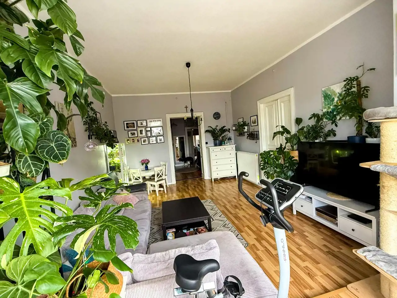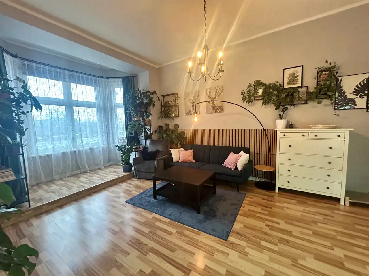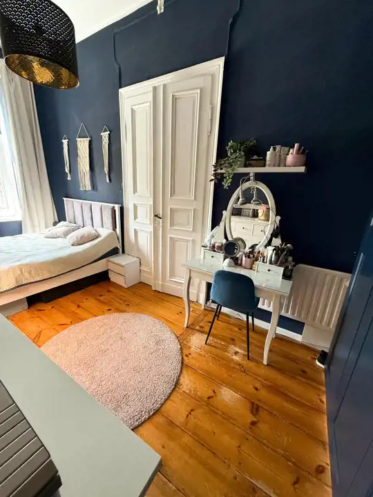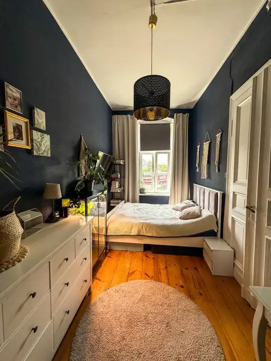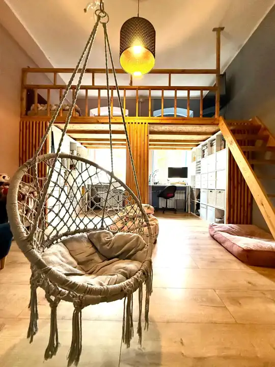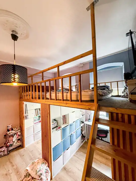 Mieszkanie jest naprawdę przestronne, z wysokimi sufitami, które potęgują poczucie swobody. Jeden z pokoi wyposażony jest w antresolę, co daje dodatkową przestrzeń do pracy, snu lub relaksu – idealne rozwiązanie, które wykorzystuje pełen potencjał wysokości wnętrza.
