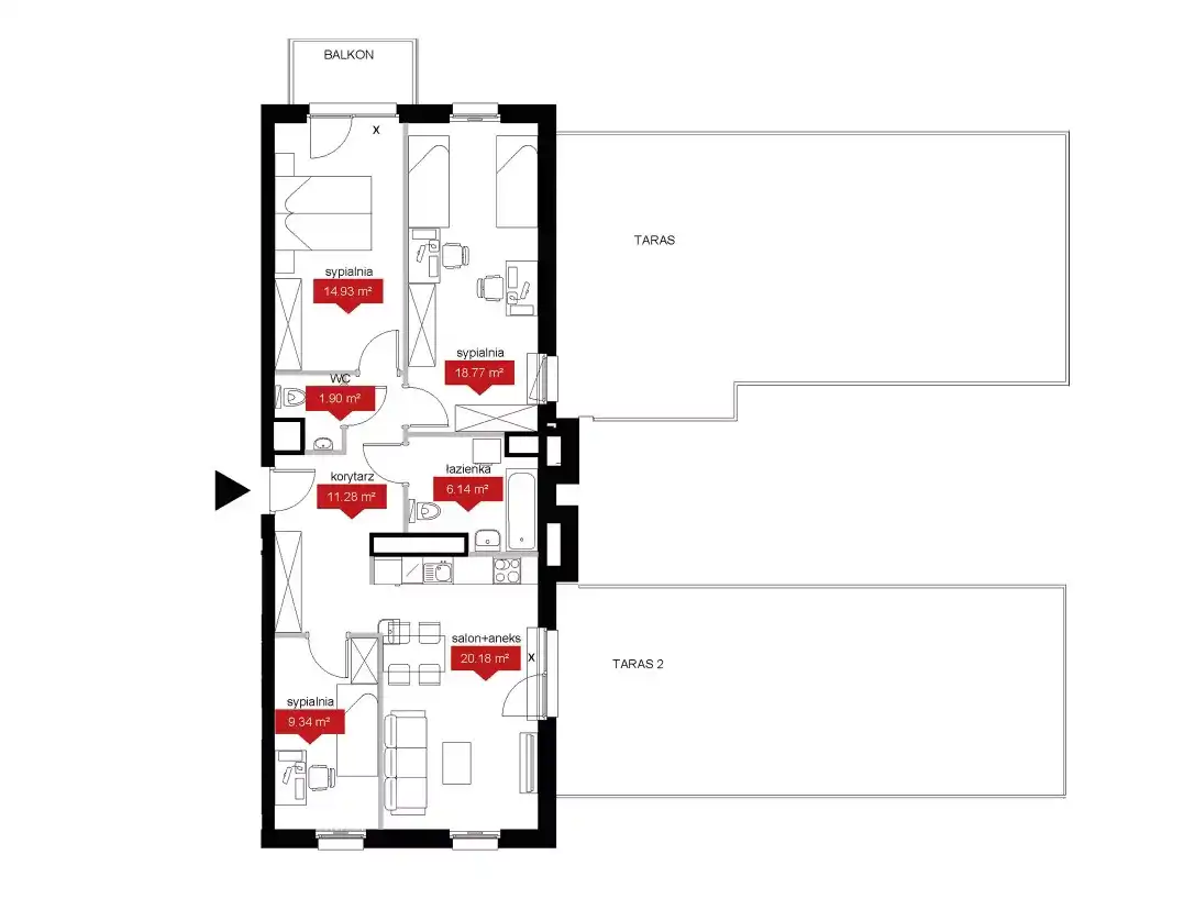- trzech oddzielnych sypialni