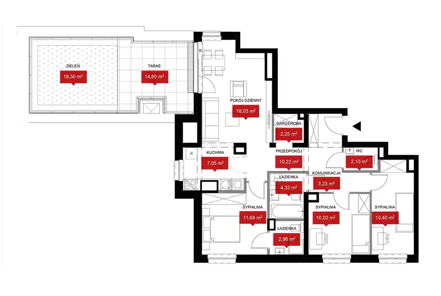 Mieszkanie o powierzchni 82,30 m2 składa się z: