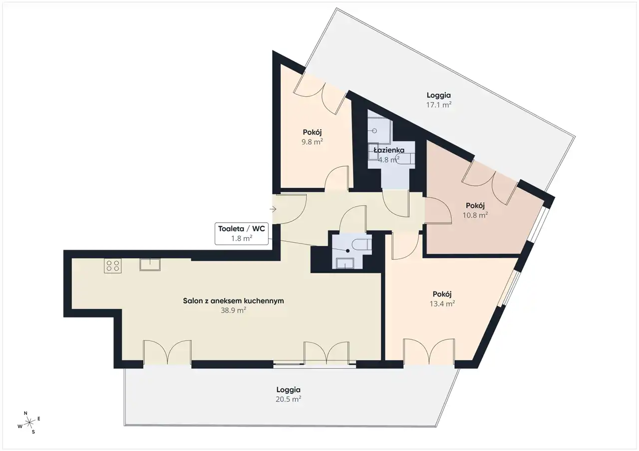 - Loggia z każdego pokoju: Unikalnym rozwiązaniem architektonicznym jest fakt, że z każdego z czterech pokoi można wyjść bezpośrednio na zewnętrzną loggię.