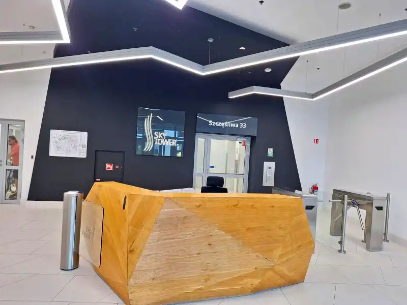 - wejście obsługiwane przez recepcję - 24h, ochrona 24h, 4 szybkie windy z kontrolą dostępu