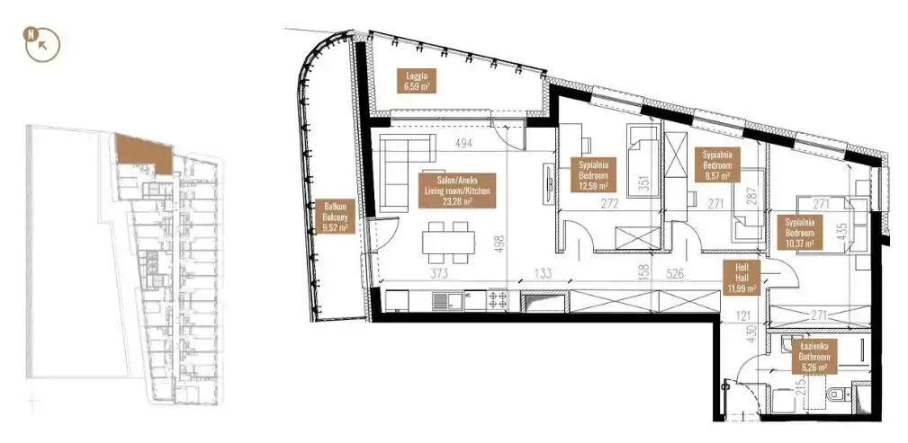 - pokój dzienny z aneksem kuchennym 23,28 m2 z wyjściem na balkon 9,52 oraz loggię 6,59 (z widokiem na Odrę)