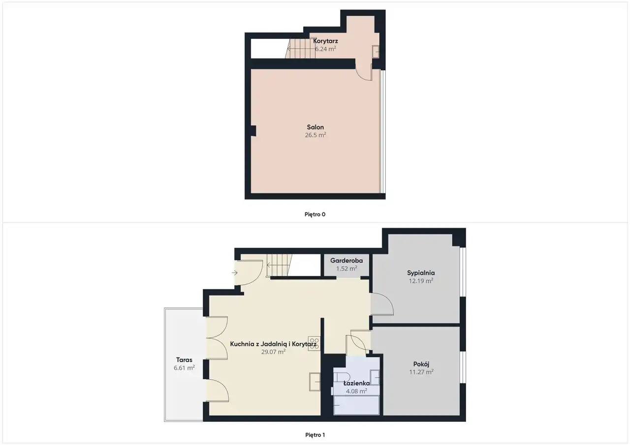 Piętro: jadalnia z aneksem kuchennym oraz wyjściem na prywatny ogródek, sypialnia, dodatkowy pokój, garderoba i łazienka