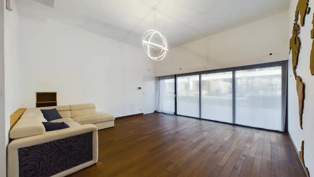 Parter: przestronny salon z przyciemnianymi oknami witrynowymi oraz wyjściem na części wspólne osiedla