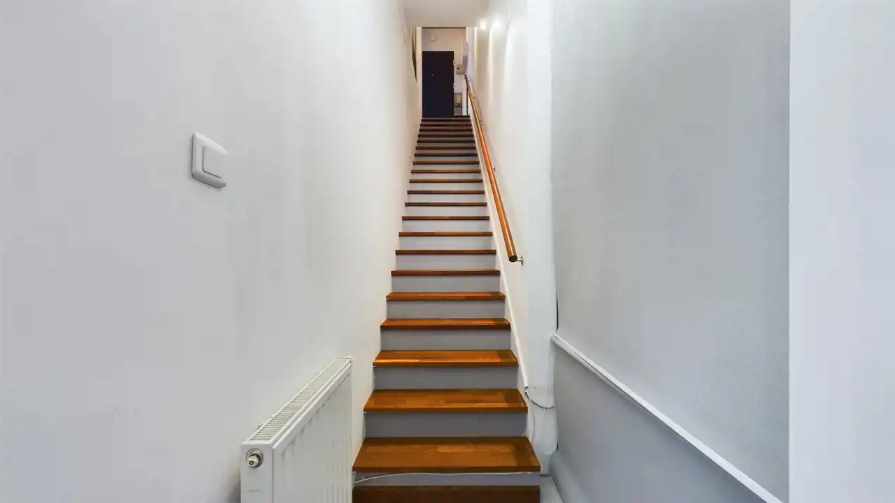 Przejście między piętrami: przy schodach znajduje się praktyczny magazynek – idealny na rowery lub sprzęt sportowy, z dostępem do funkcjonalnej umywalki. Dodatkowe wyjście z salonu umożliwia szybkie wyjazdy rowerem bez konieczności przechodzenia przez całe mieszkanie.