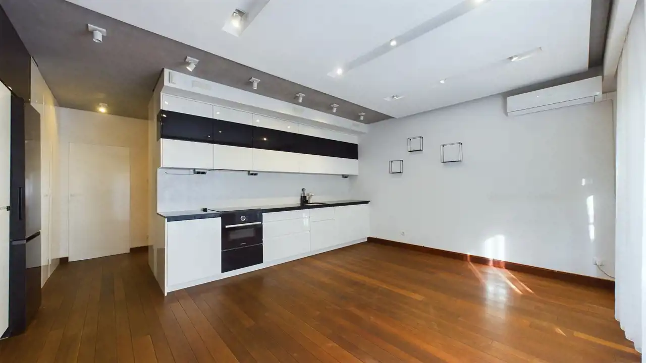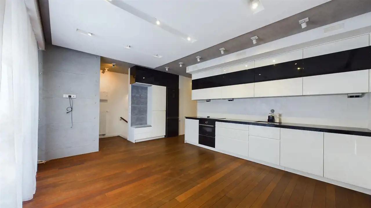 - Nowoczesna kuchnia – zabudowa na wymiar z wysokiej jakości materiałów, wyposażona w systemy BLUM, piekarnik i płytę indukcyjną oraz lodówkę