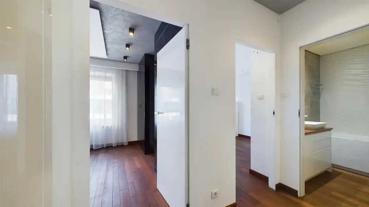 - Przemyślane rozwiązania przechowywania – świetnie zaaranżowana garderoba, liczne szafy i półki w zabudowie