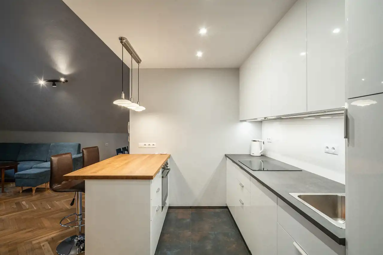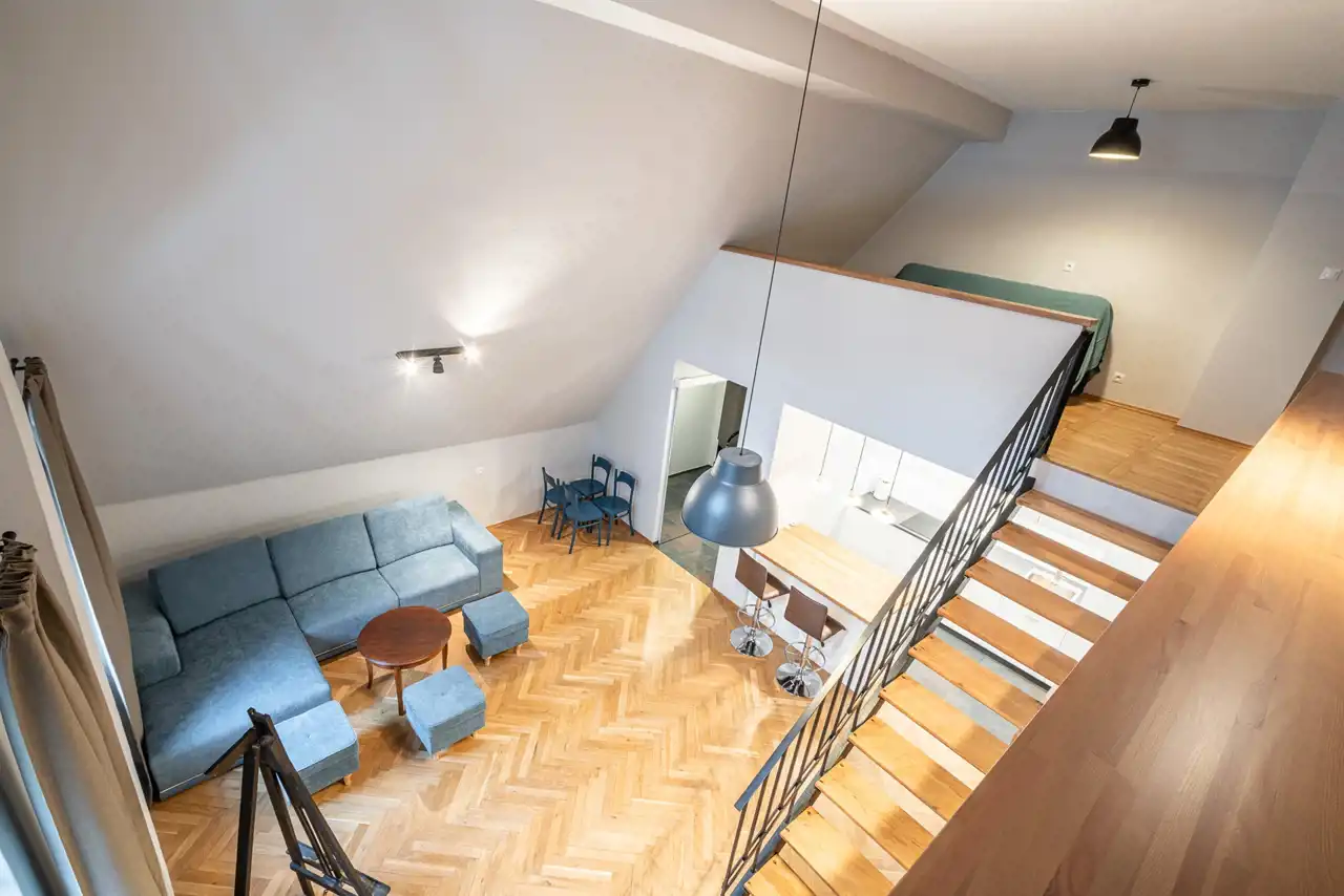 To wyjątkowe mieszkanie składa się z przestronnego salonu typu open space, połączonego z aneksem kuchennym oraz wejściem na antresolę. Mieszkanie cechuje się imponującą wysokością salonu - około 4 metry, co nadaje mu wyjątkowego charakteru i uroku.