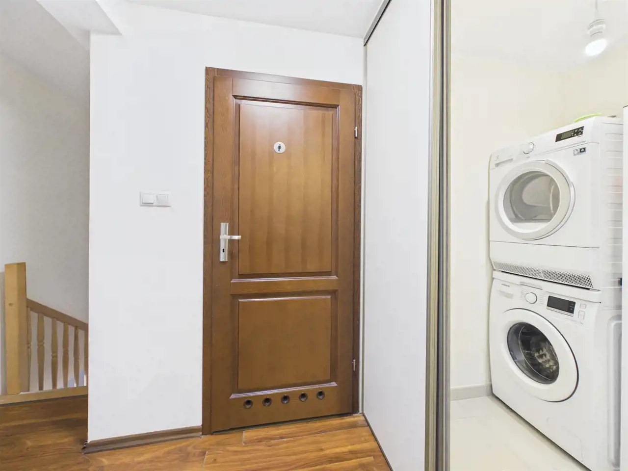 - Obok znajduje się Pralnia z pralką oraz suszarką sprytnie ukryte za przesuwnymi drzwiami,