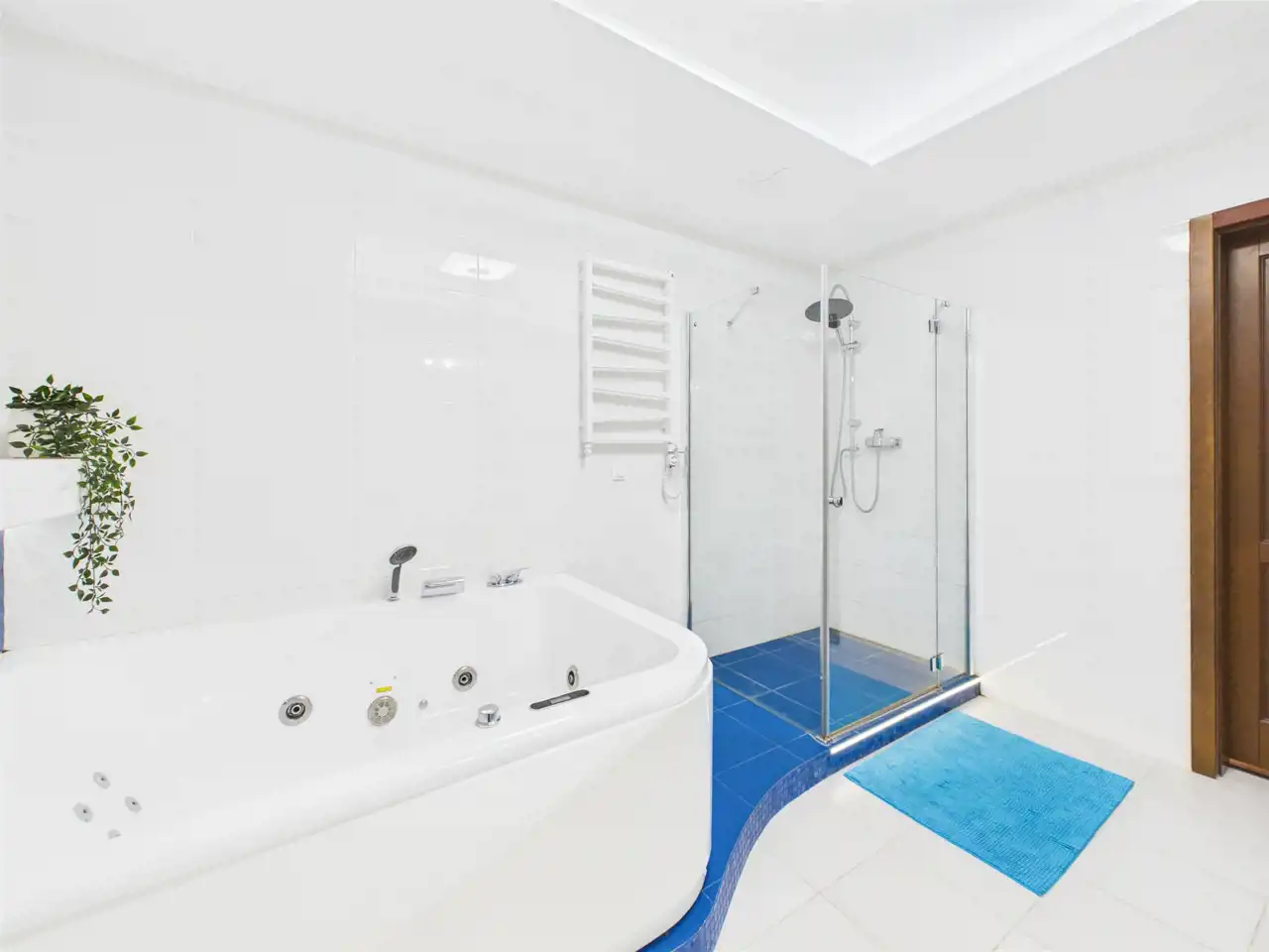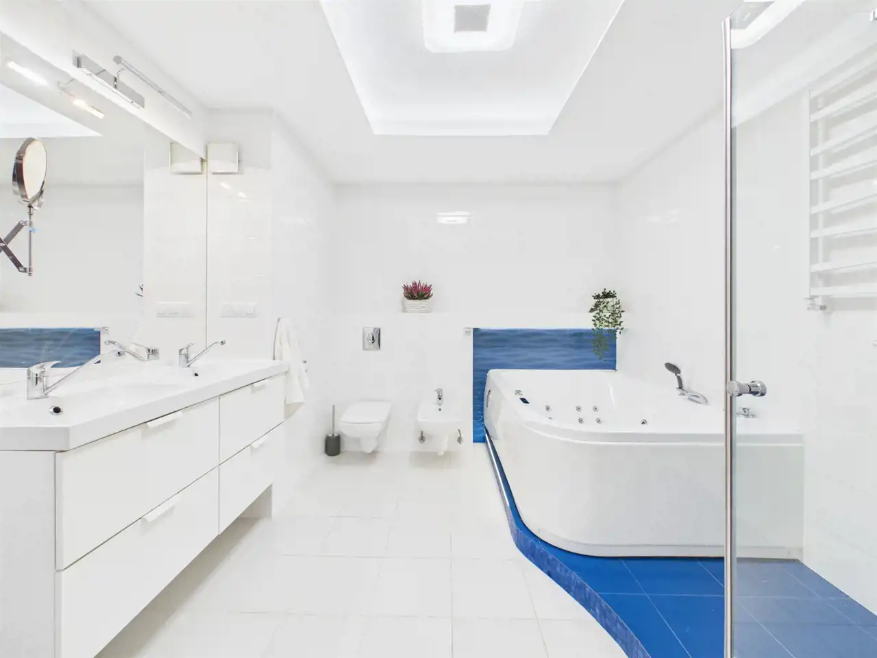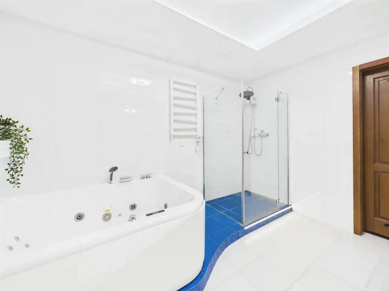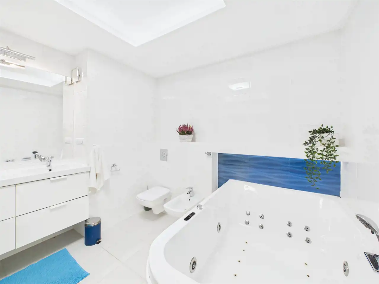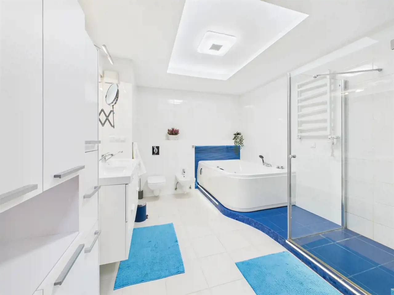 - Pokój kąpielowy z wanną z jacuzzi, prysznic walk-in, dwie umywalki oraz bidet,