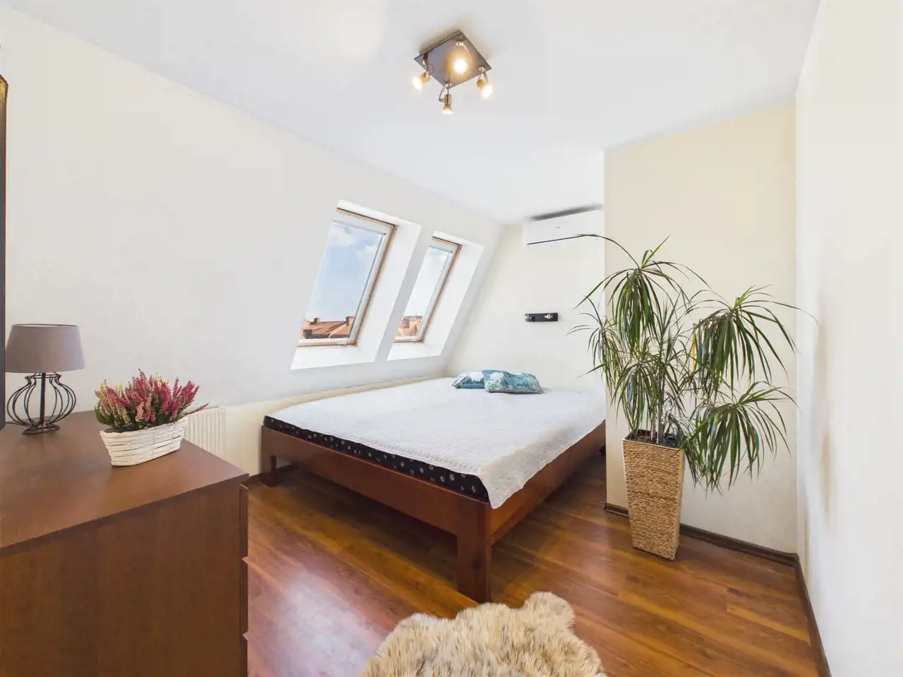 - Sypialna z dużym łóżkiem małżeńskim i klimatyzacją.