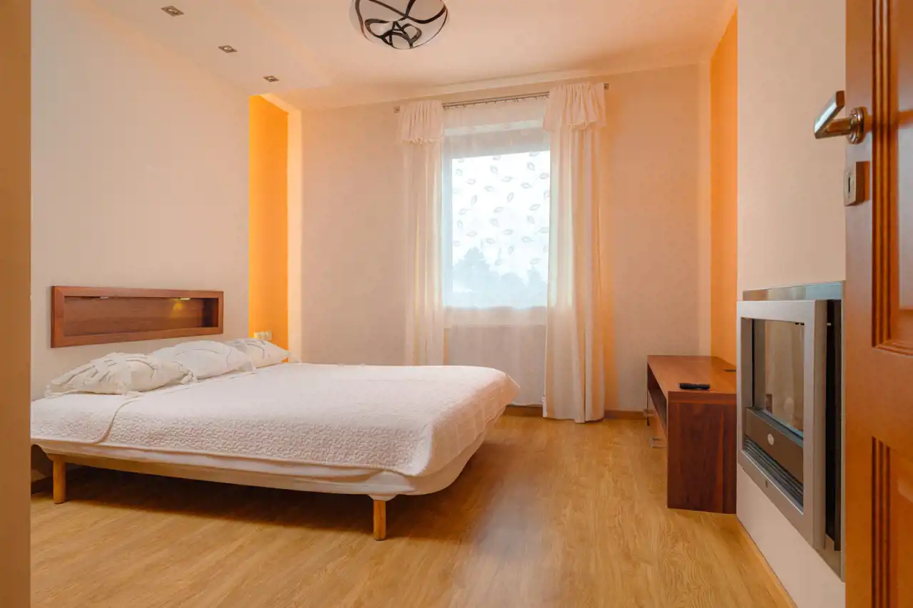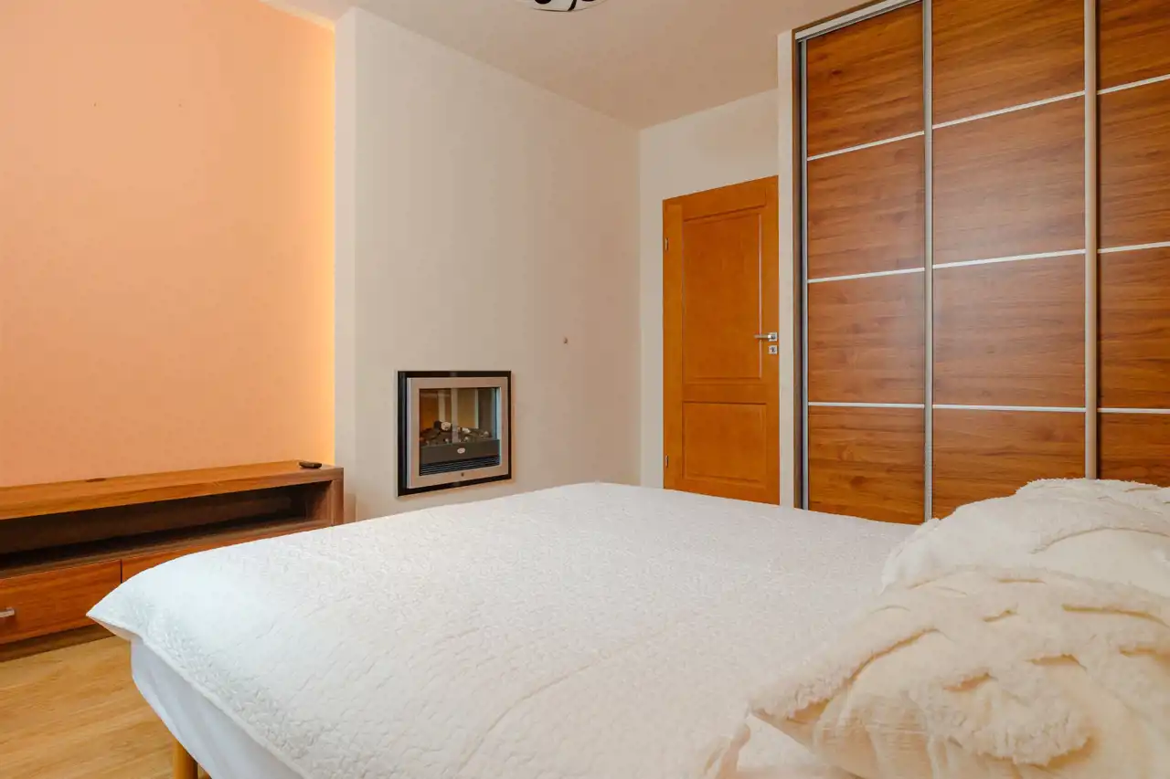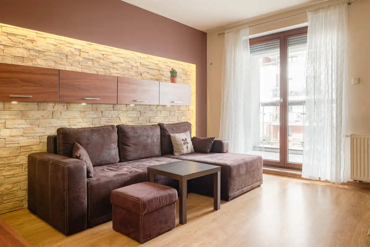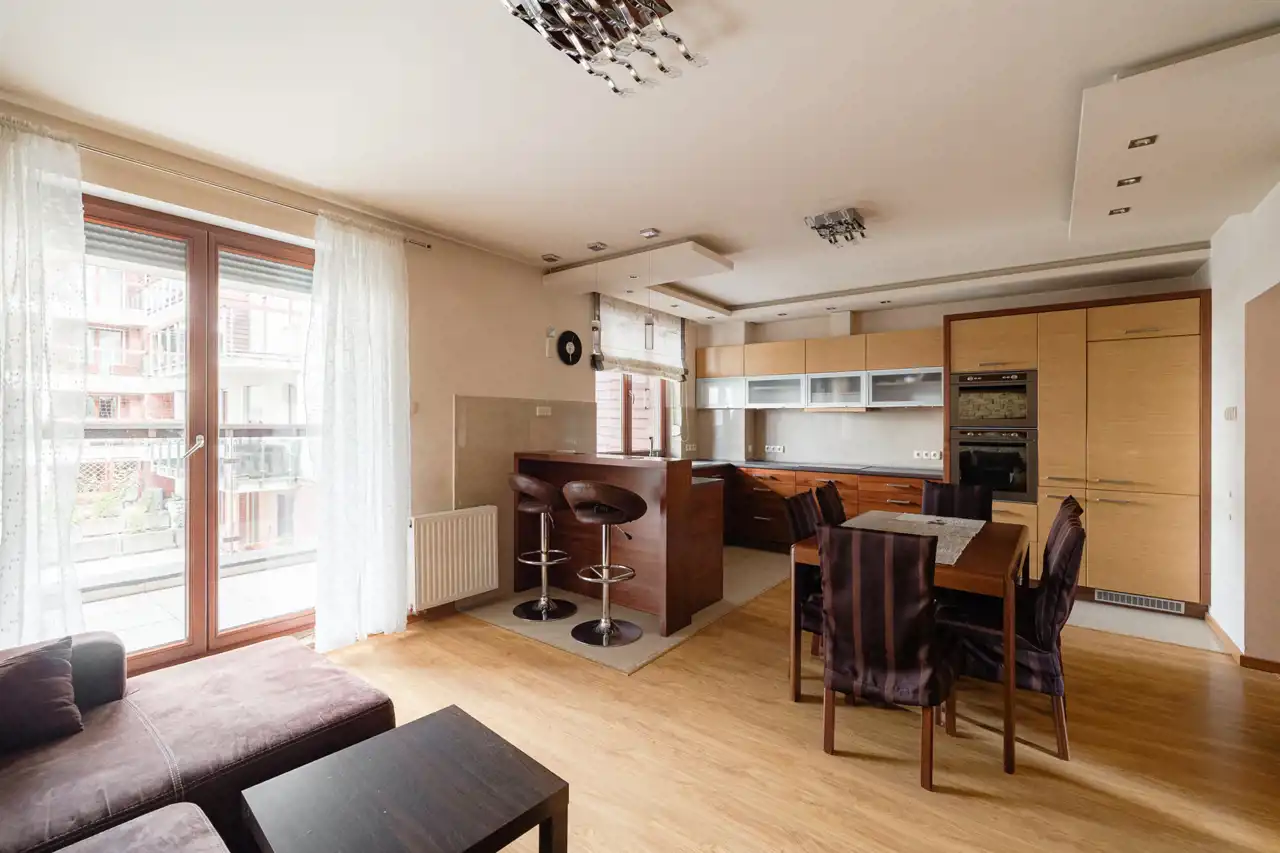 W mieszkaniu pozostają wszystkie meble widoczne na zdjęciach, co sprawia, że nieruchomość jest gotowa do zamieszkania. Kuchnia wyposażona jest w zabudowę meblową oraz sprzęty AGD, w tym płytę indukcyjną, piekarnik i kuchenkę mikrofalową. W lokalu doprowadzona została również siła. Na podłogach znajdują się panele oraz kafle. Okna są dwuszybowe, a we wszystkich zamontowano rolety. Dodatkowym elementem wyposażenia jest wideodomofon, a przy jednej z sypialni znajduje się także domofon. W jednym z pokoi zamontowano biokominek elektryczny.