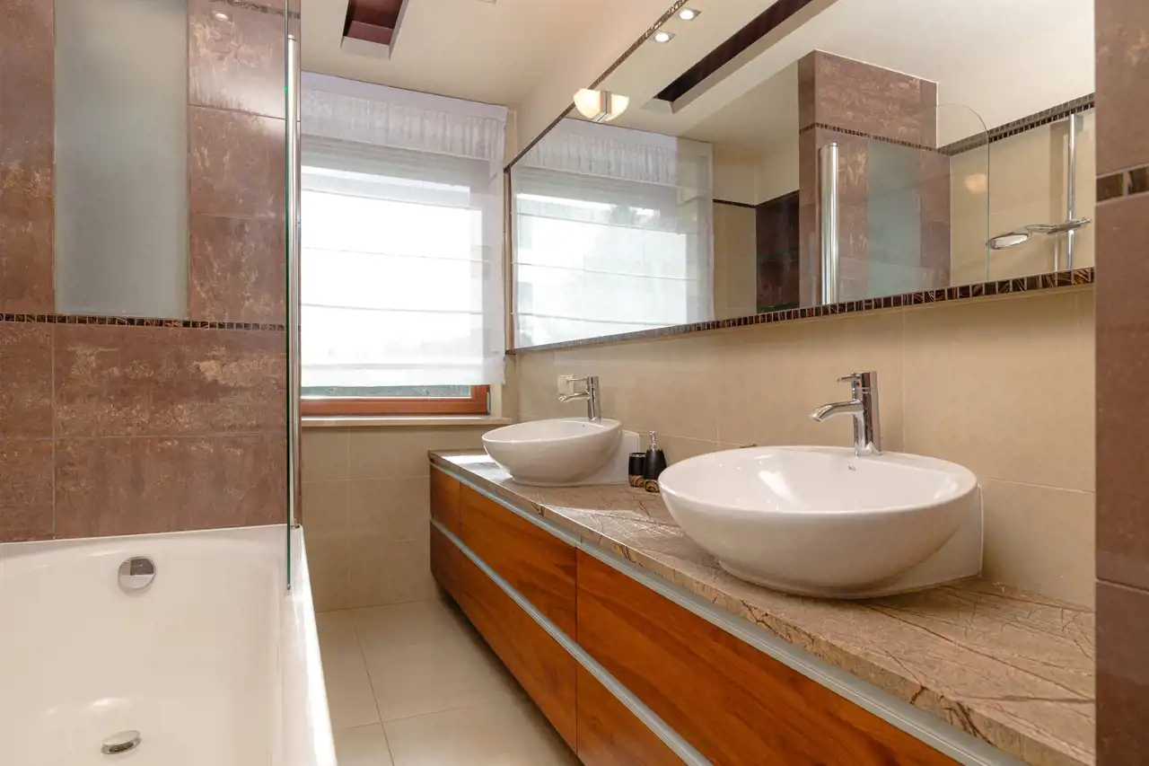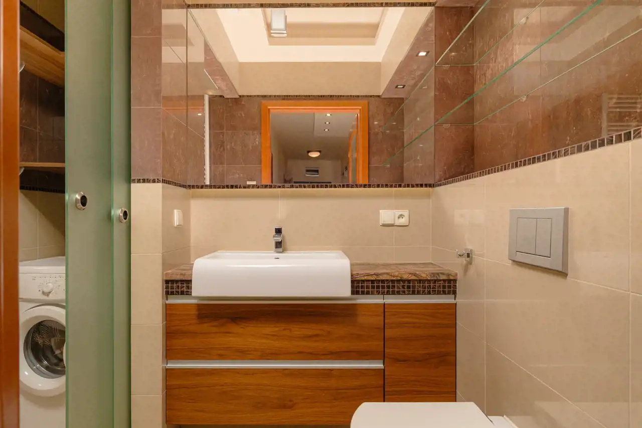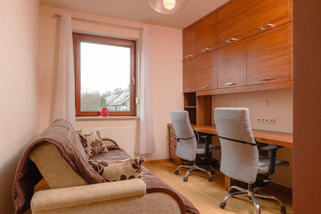 Dużym atutem jest funkcjonalny układ pomieszczeń oraz komfort codziennego użytkowania. W jednej z łazienek wydzielono dodatkową przestrzeń, która z powodzeniem służy jako pralnia.