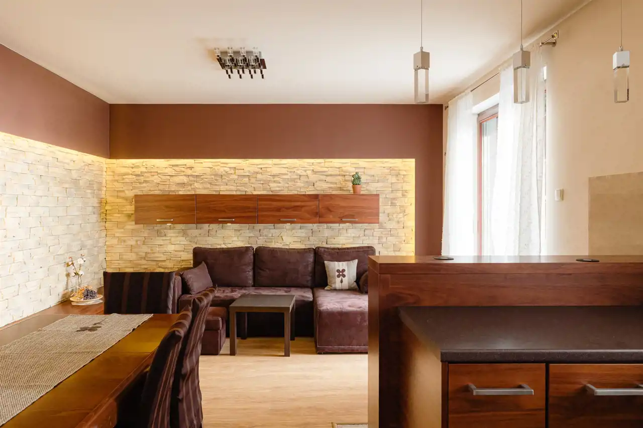 - przestronnego salonu z aneksem kuchennym i wyjściem na bardzo duży balkon,