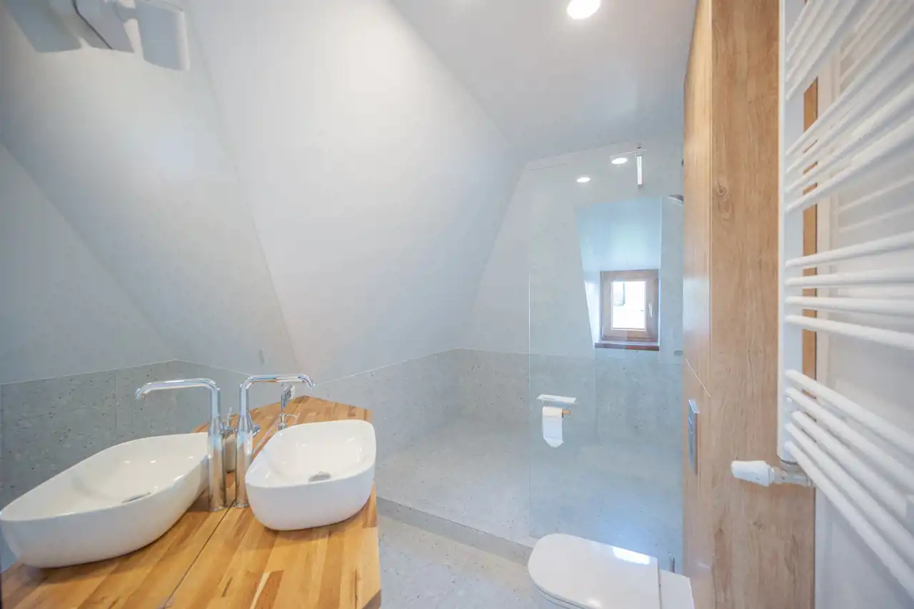 Centralną część mieszkania stanowi przestronny salon z otwartą kuchnią, jadalnią oraz wyjściem na duży taras. Na pozostały metraż składają się dwie sypialnie, antresola oraz toaleta i duża łazienka