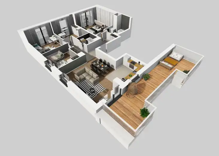 Mieszkanie składa się z przestronnego pokoju dziennego z aneksem kuchennym (32m2), czterech ustawnych sypialni (jedna z garderobą), przedpokoju z miejscem na szafę, 2 łazienek oraz dodatkowo tarasu(30m2) oraz 2 balkonów.