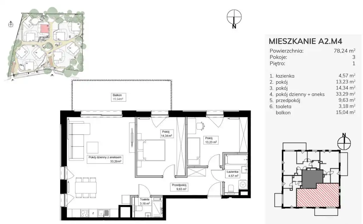 - Charakterystyka mieszkania 78.24 m2, 3 pokoje