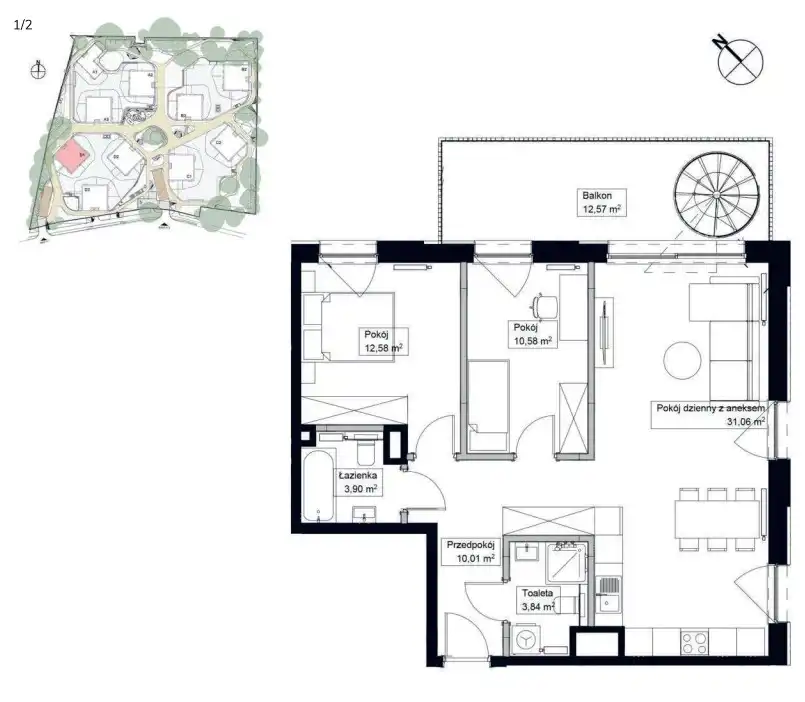 3 pokojowy apartament z tarasem na dachu, w otoczeniu parku. Na inwestycji są dostępne inne metraże i układy mieszkań.