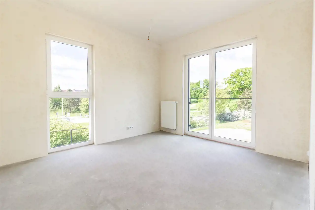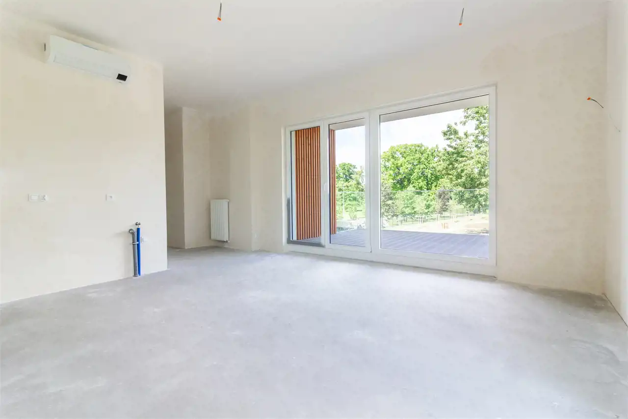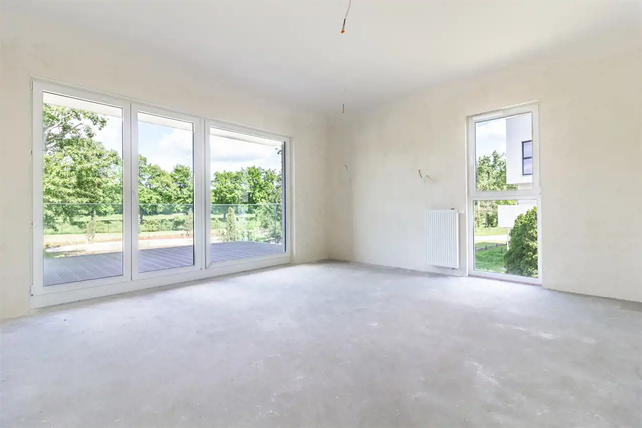 Z salonu roztacza się niezwykły widok na zieleń i w stronę rzeki Odry — mieszkanie znajduje się w pierwszym rzędzie zabudowy, co gwarantuje bezpośredni kontakt z naturą i brak sąsiednich okien „naprzeciw”.