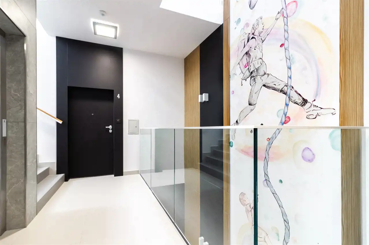 Ogromnym atutem tego apartamentu jest jego wysokość – 3,03 m, która w połączeniu z podwyższoną stolarką okienną (2,45 m) oraz szklanymi balustradami sprawia, że wnętrze jest pełne światła.