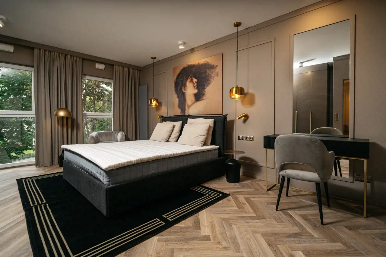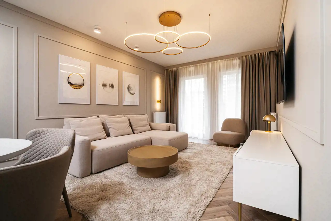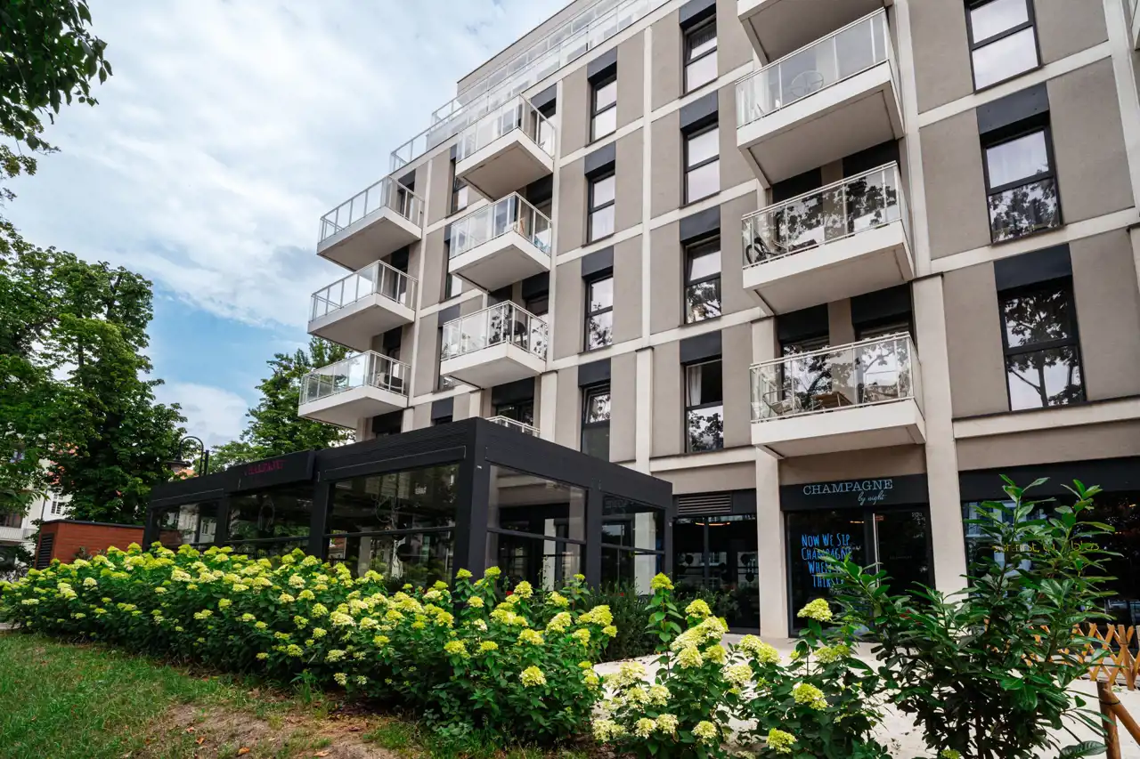 Pierwotnie jako lokal trzypokojowy, obecnie oferuje przestronny salon połączony z kuchnią (32 m2) z wyjściem na balkon, komfortową sypialnię (22 m2), dwie nowoczesne łazienki (5,02 m2 i 4,97 m2) oraz przedpokój (2,67 m2). Z okien oraz balkonu rozpościera się uspokajający widok na piękny, zielony dziedziniec – prywatną oazę ciszy w centrum miasta.