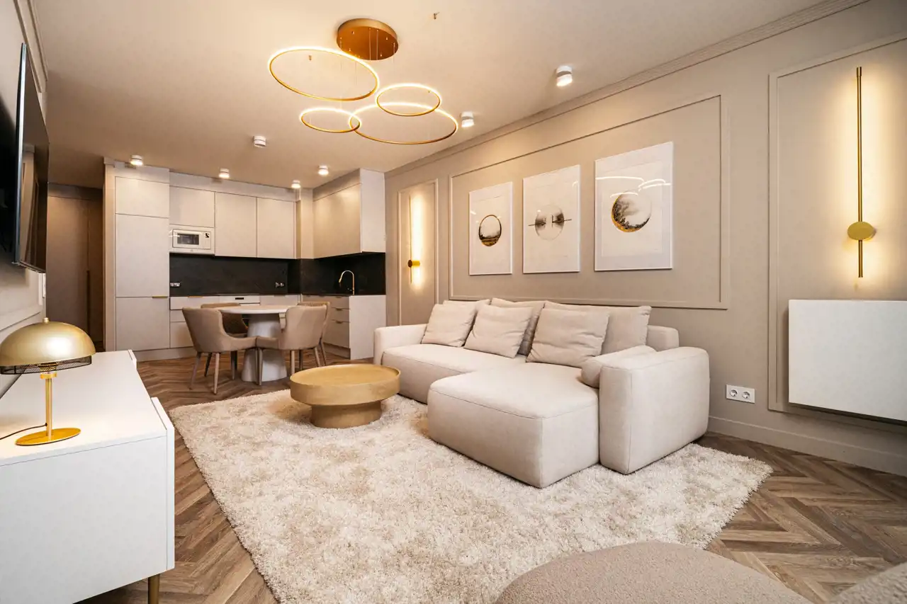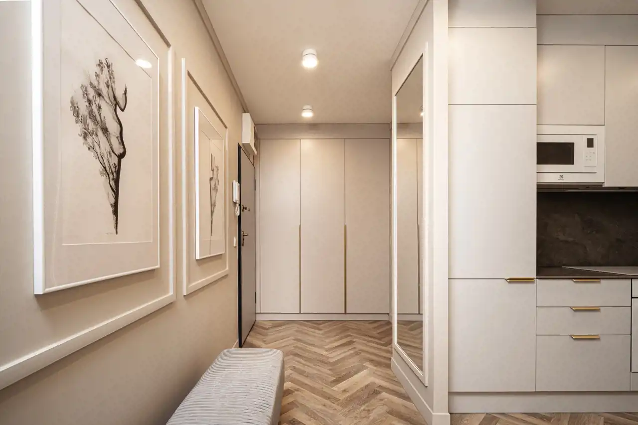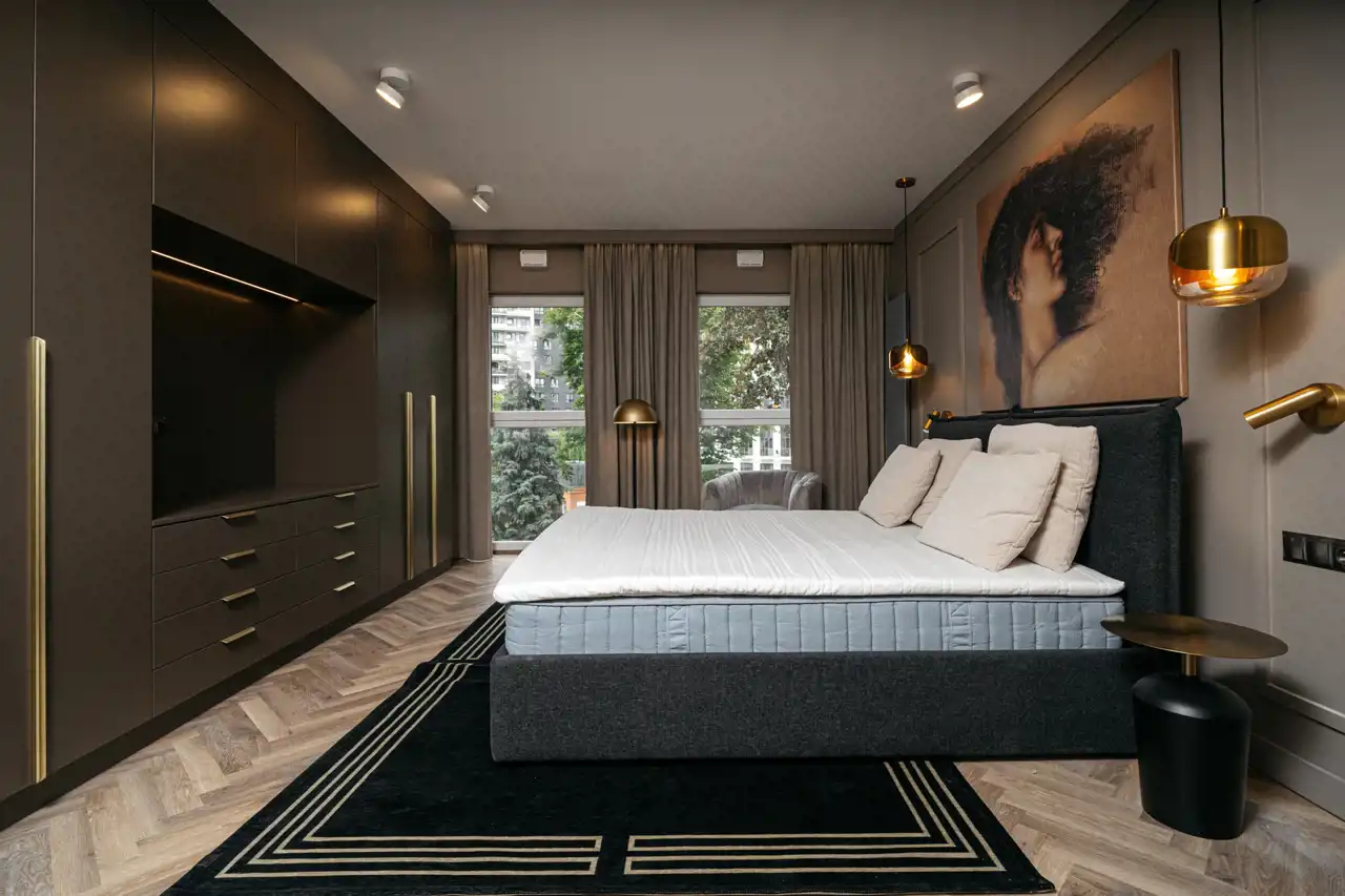 Pierwotnie jako lokal trzypokojowy, obecnie oferuje przestronny salon połączony z kuchnią (32 m2) z wyjściem na balkon, komfortową sypialnię (22 m2), dwie nowoczesne łazienki (5,02 m2 i 4,97 m2) oraz przedpokój (2,67 m2). Z okien oraz balkonu rozpościera się uspokajający widok na piękny, zielony dziedziniec – prywatną oazę ciszy w centrum miasta.