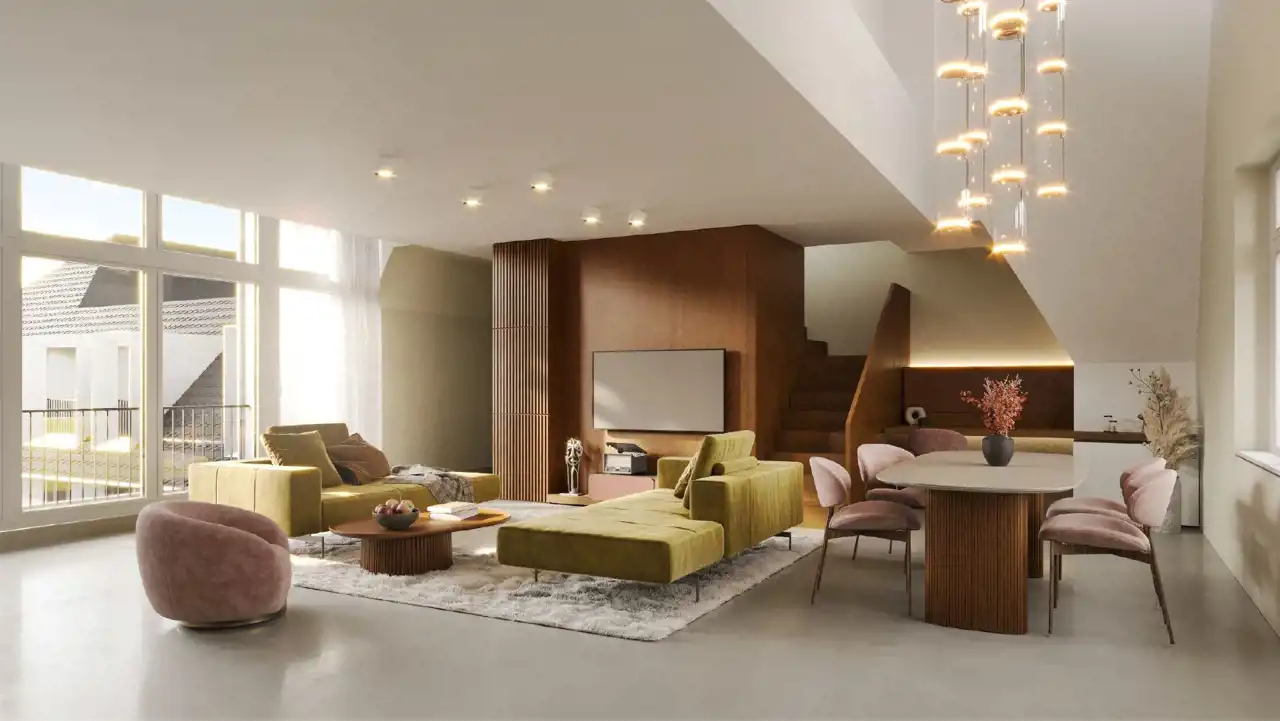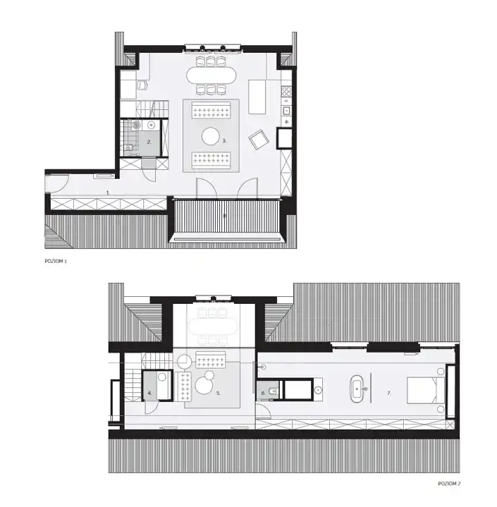 Pierwszy poziom: Awangardowa przestrzeń dzienna składająca się z przestronnego salonu z wejściem na taras oraz kuchni. Salon jest jasny i przestronny, tworząc komfortową przestrzeń do wypoczynku i spotkań z rodziną lub przyjaciółmi. W jadalni znajduje się duży, stylowy stół otoczony wygodnymi krzesłami. Nad stołem zawieszona jest designerska lampa, która dodaje wnętrzu nowoczesnego charakteru. Na tym poziomie znajduje się również dodatkowy pokój, który może służyć jako gabinet, sypialnia lub pokój gościnny.