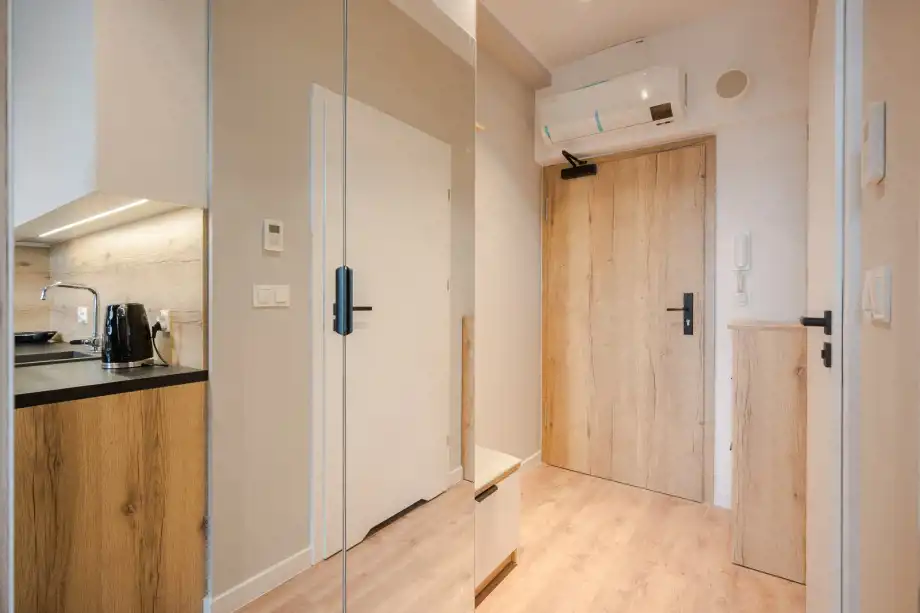 Lokal- o powierzchni 22,7 m² składa się z przestronnego salonu połączonego z aneksem kuchennym, korytarza oraz łazienki. Mieszkanie jest funkcjonalne i dobrze doświetlone. Lokal jest w pełni wyposażony. Aneks kuchenny wykonany pod wymiar z zabudowanymi sprzętami AGD. Łazienka wykończona nowocześnie z dużą kabiną prysznicową. Dla pełnego komfortu zamontowano klimatyzacje. Do mieszkania przynależy miejsce w hali garażowej. Ogrzewanie miejskie.