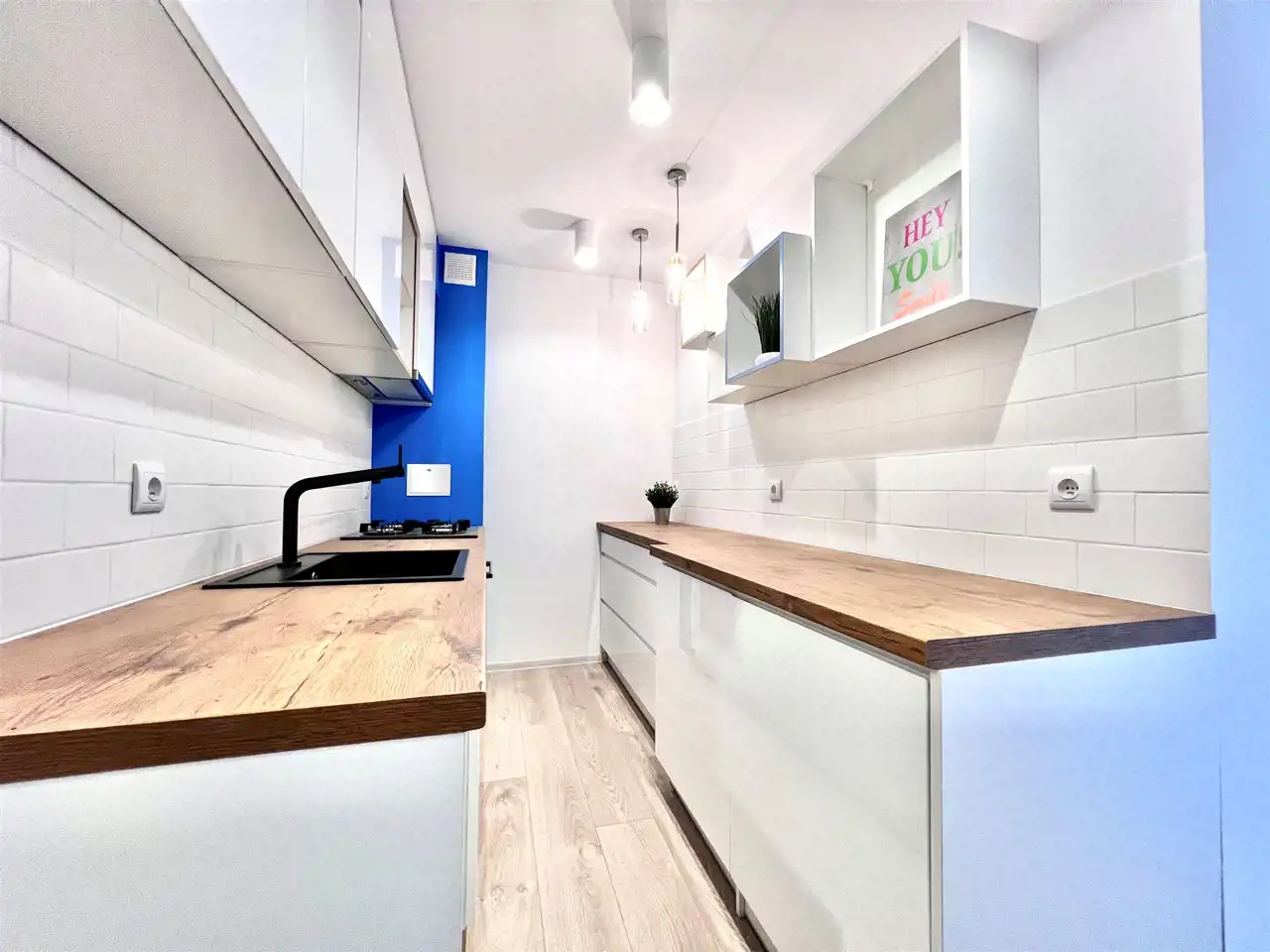Mieszkanie przeszło generalny remont, podczas którego została wymieniona instalacja elektryczna w całości na miedzianą. Zrobione wylewki, gładzie, położone panele w pokojach, kafle w przedpokoju łazience i kuchni, meble kuchenne. Okna PCV, meble kuchenne oraz szafa w pokoju – na wymiar. Meble kuchnne zaprojektowane tak aby uzyskać jak najwięcej przestrzenni i blatu roboczego. Pod blatem kuchennym oprócz funkcjonalnych szafek znajdują się sprzęty AGD takie jak: zmywaka, lodówka, obok niej zamrażarka oraz pralka. Ogólny stan mieszkania jest b.dobry.