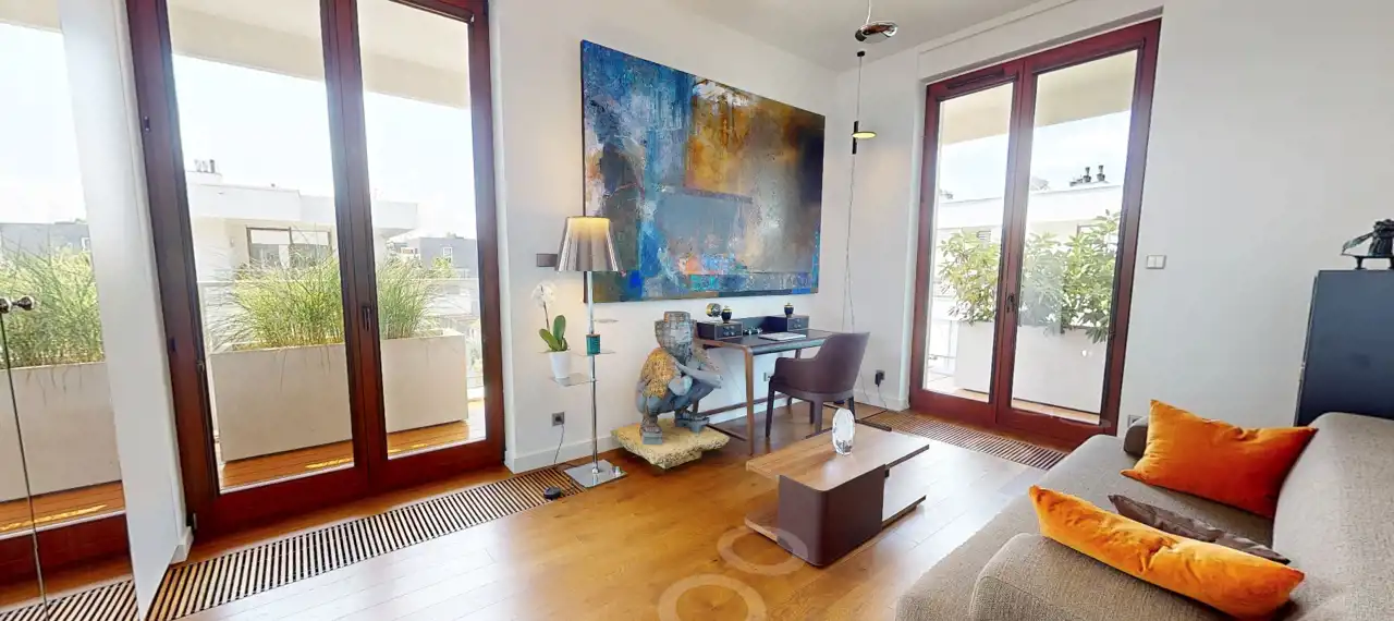 Na szczególną uwagę zasługuje unikatowy charakter apartamentu – prywatna winda, która wjeżdża bezpośrednio do mieszkania, zapewniając pełną intymność i wygodę. Dodatkowym atutem jest przestronny taras, otaczający cały apartament, wyposażony w komfortowy komplet wypoczynkowy oraz miejsce na barbecue – idealne na wieczory z przyjaciółmi i rodziną.