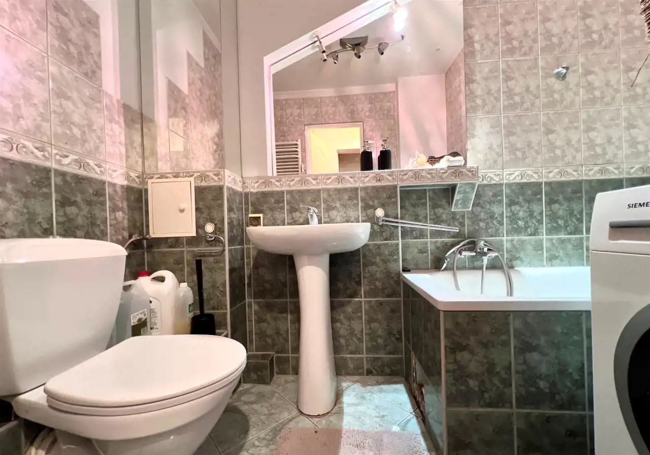 - łazienka z wanną i miejscem na pralkę