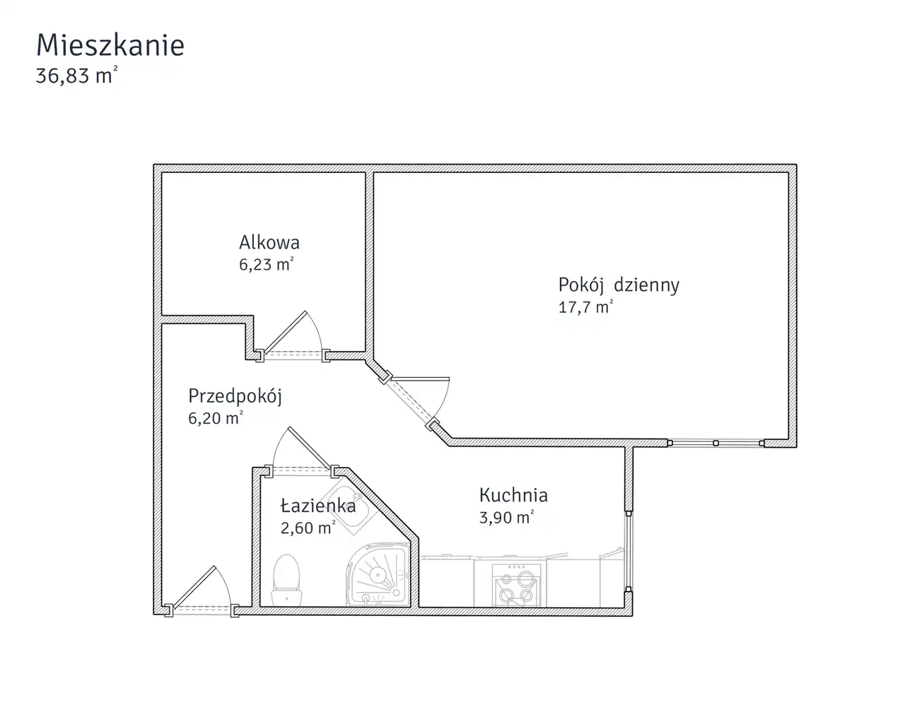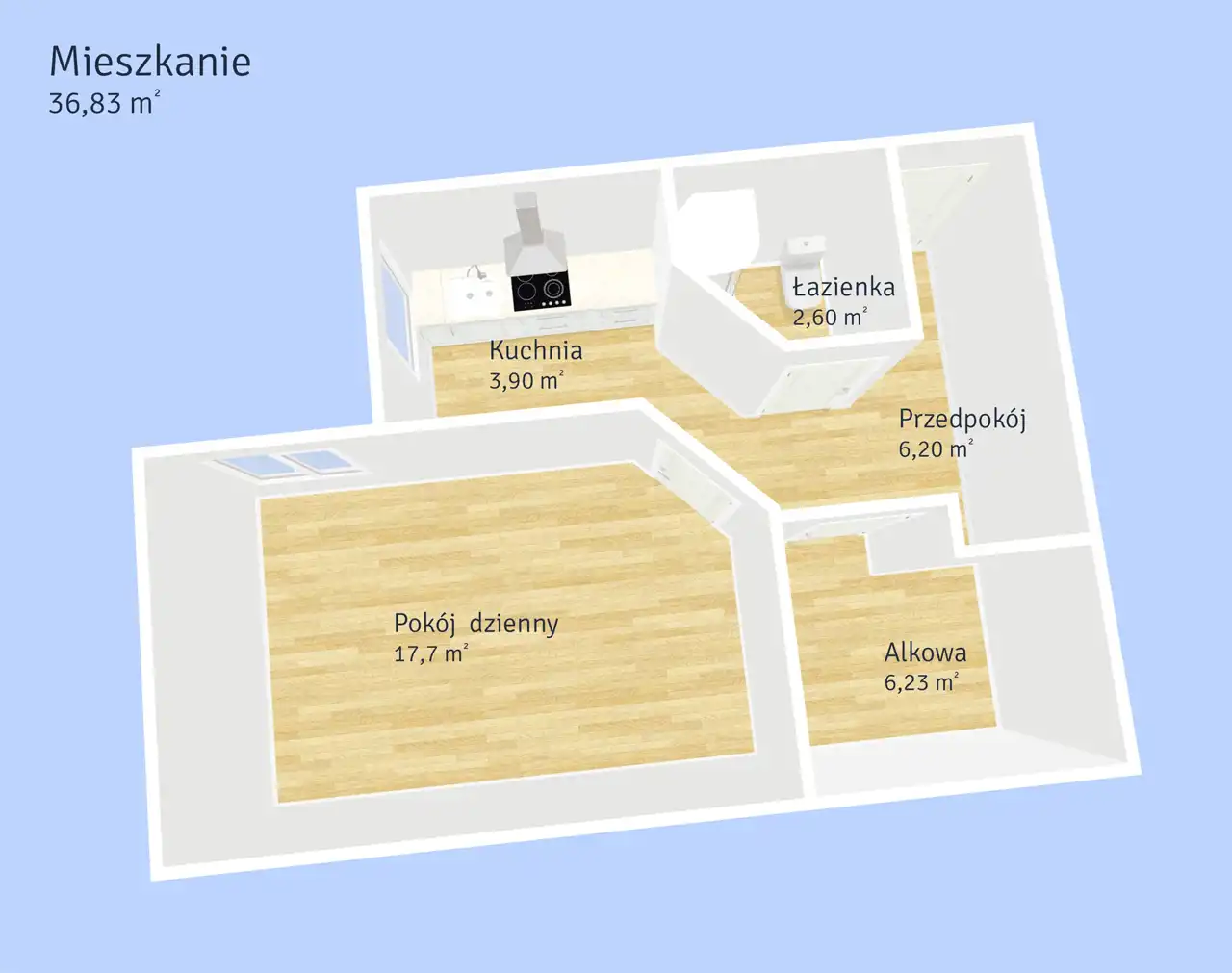 - Charakterystyka mieszkania 43.79 m2, 2 pokoje