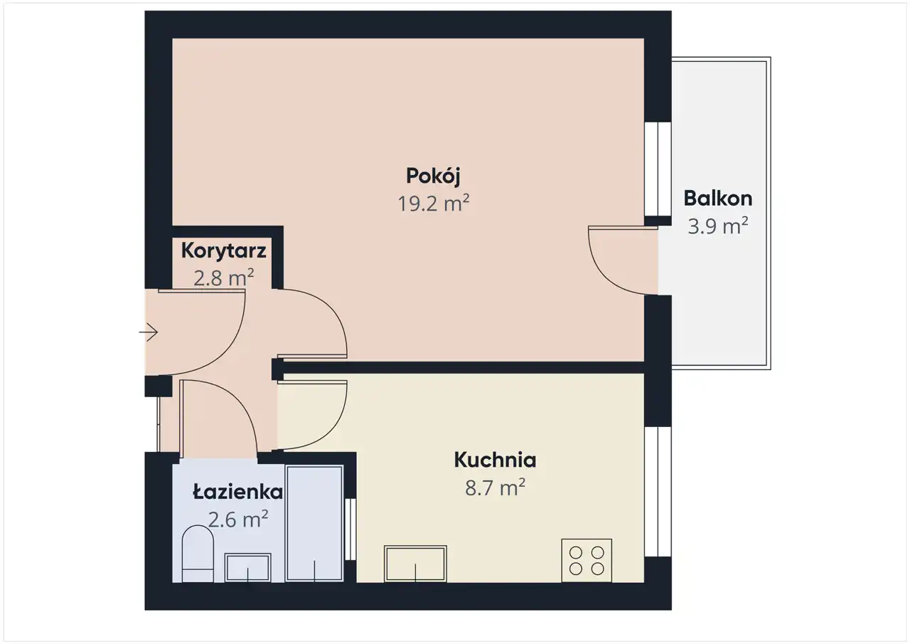 - doskonały układ – wydzielony przedpokój, pokój oraz kuchnia