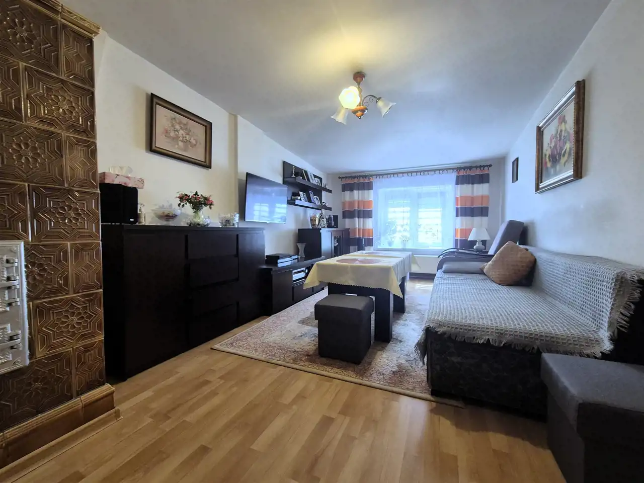 Na podłogach panele i kafle w zależności od pomieszczeń.