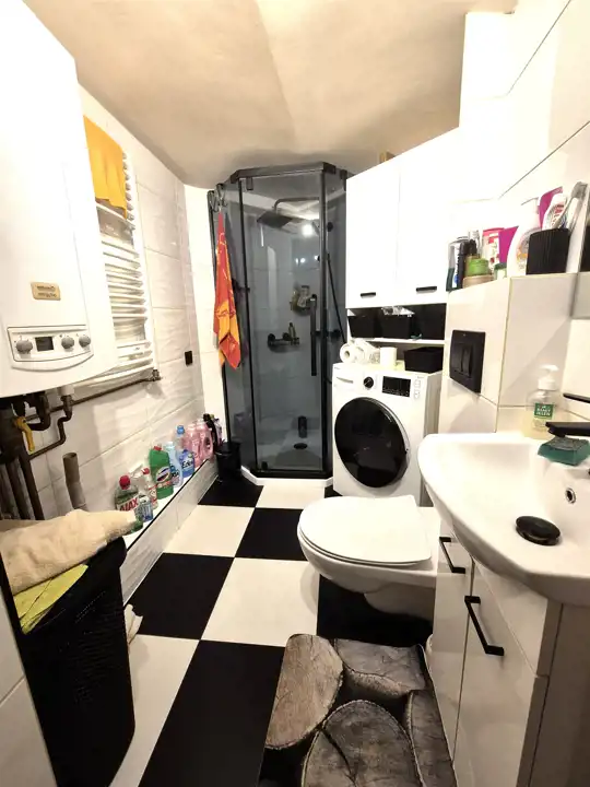 Łazienka razem z wc z kabiną prysznicową.