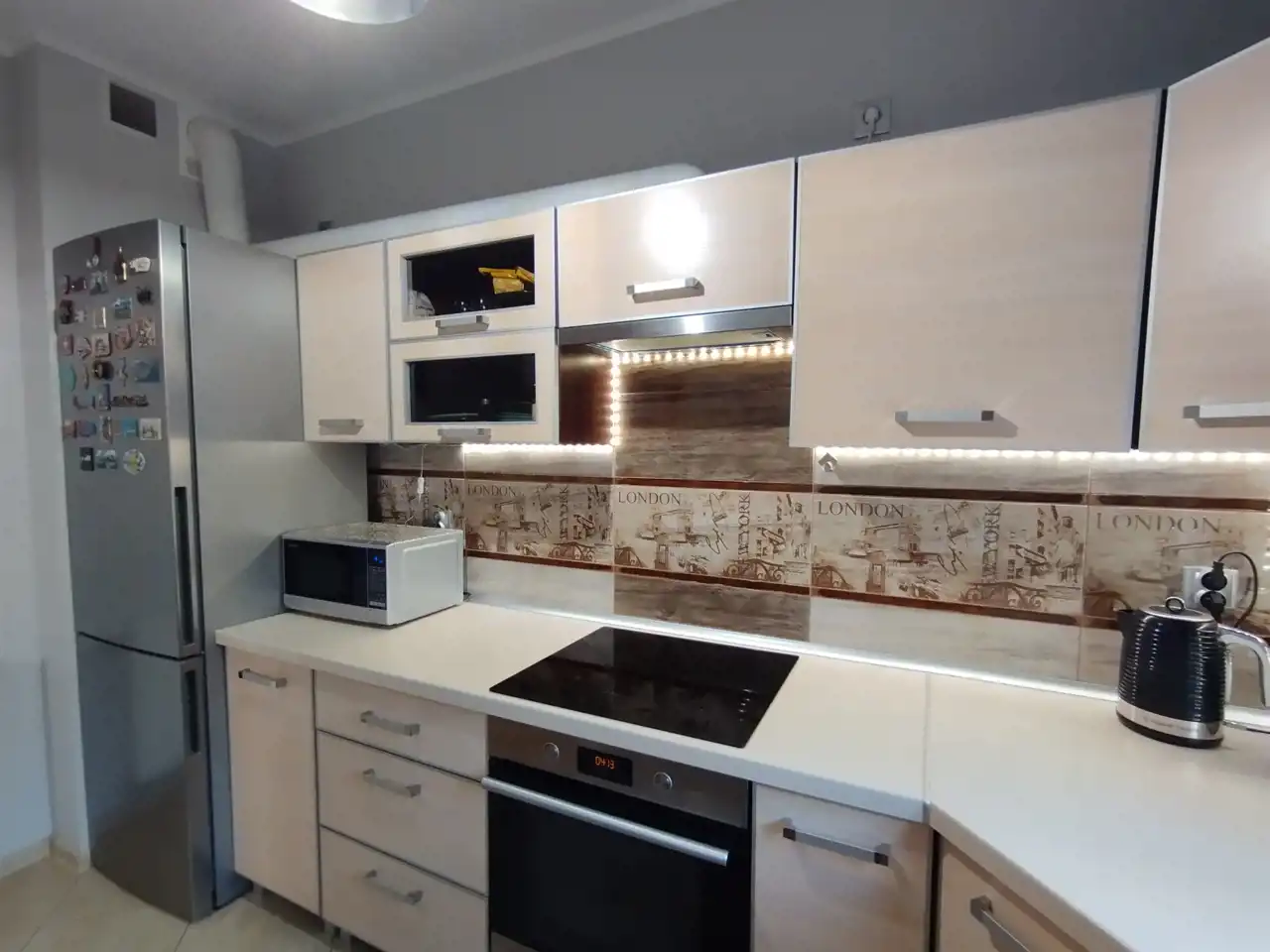 płyta indukcyjna, piekarnik, lodówka, okap, zlew.