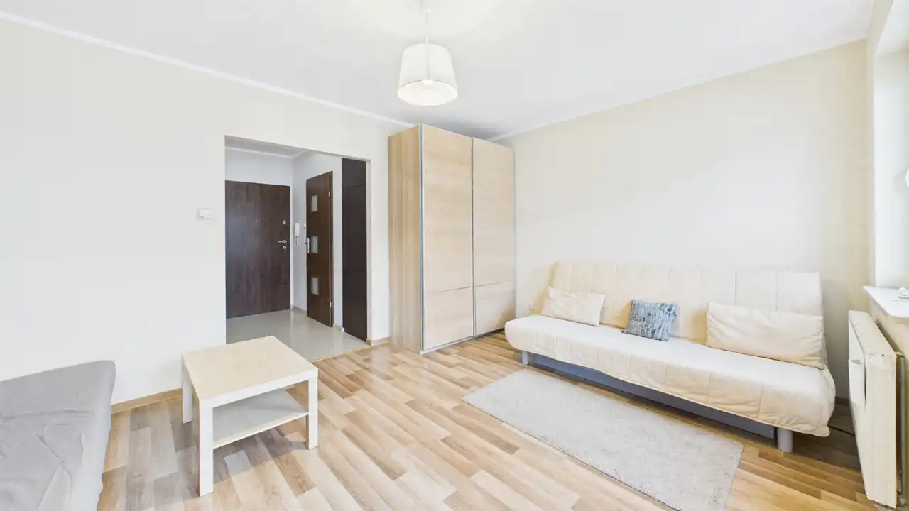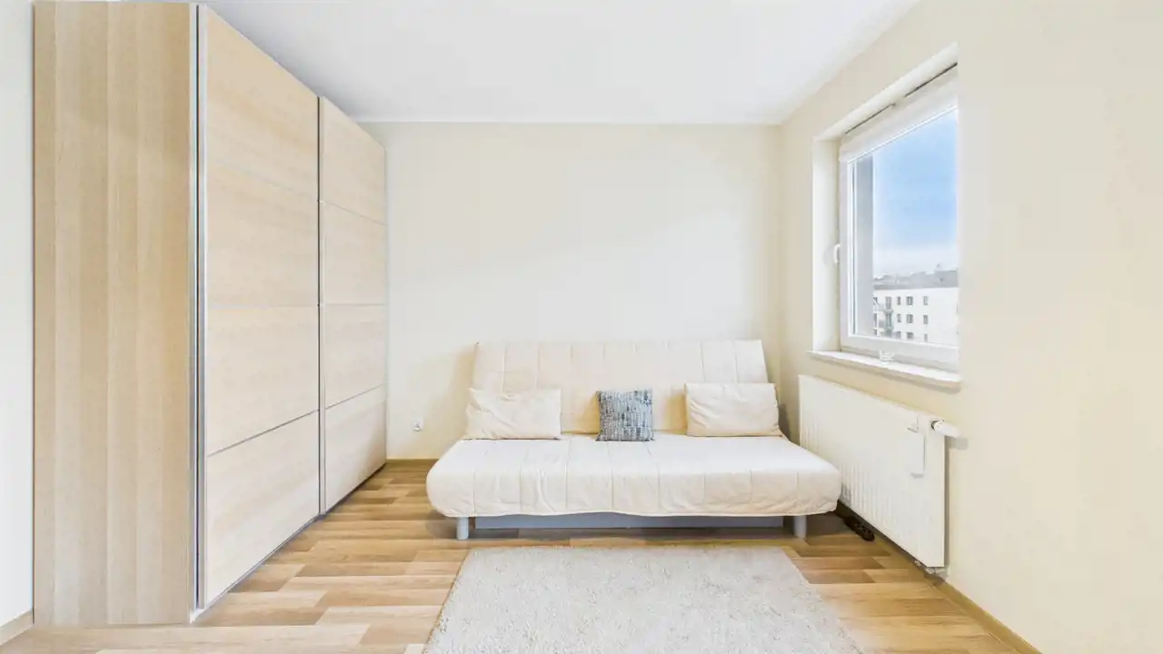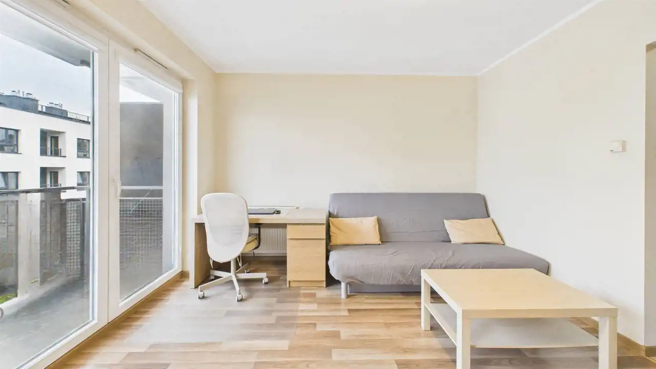 przestronny pokój dzienny z pojemną szafą i wyjściem na balkon,